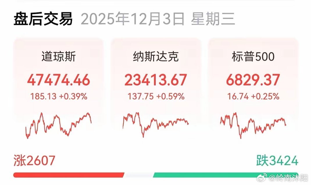 美东时间12月2日,美股三大指数集体高开后震荡上行,最终悉数收涨,科技股与中概股呈现分化态势。其中,纳斯达克综合指数涨幅领先,收涨0.59%;道琼斯工业平均指数上涨0.39%,标普500指数微涨0.25%。个股表现方面,美股整体跌多涨少,热门科技股涨跌互现:英伟达上涨0.77%,谷歌母公司Alphabet小幅上涨0.24%,特斯拉则微跌0.21%。中概股方面,纳斯达克中国金龙指数收跌0.65%,阿里巴巴大跌1.91%,京东逆势上涨0.54%,板块内部分化明显。