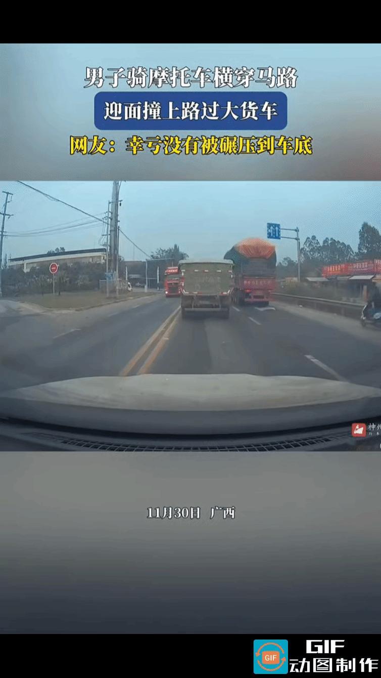 又是一次惊险的鬼探头,男子骑摩托车横穿马路,越过双实线,撞上了迎面驶来的大货车。