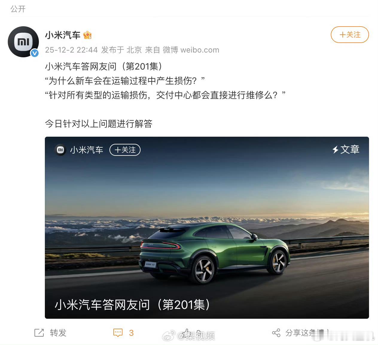 小米汽车谈为何新车在运输中损伤运损车每个品牌都有类似的情况,就是在运输途中遇到的情况,这种鸡毛蒜皮的小事也能上热搜,也真的服了友商的钞能力。关键是这种是行业普遍情况,有概率发生,小米也给了三个解决方案,其中包含重新排产或者直接换一台同配置新车,可是所有热搜基本上都把焦点放在小米不退定金上。几十万的车,已经生产出来了,长途跋涉到这,路上的各种费用也不少,关键是小米也提出了换台新车的方案,我只能说真正想买车的人不会这样。