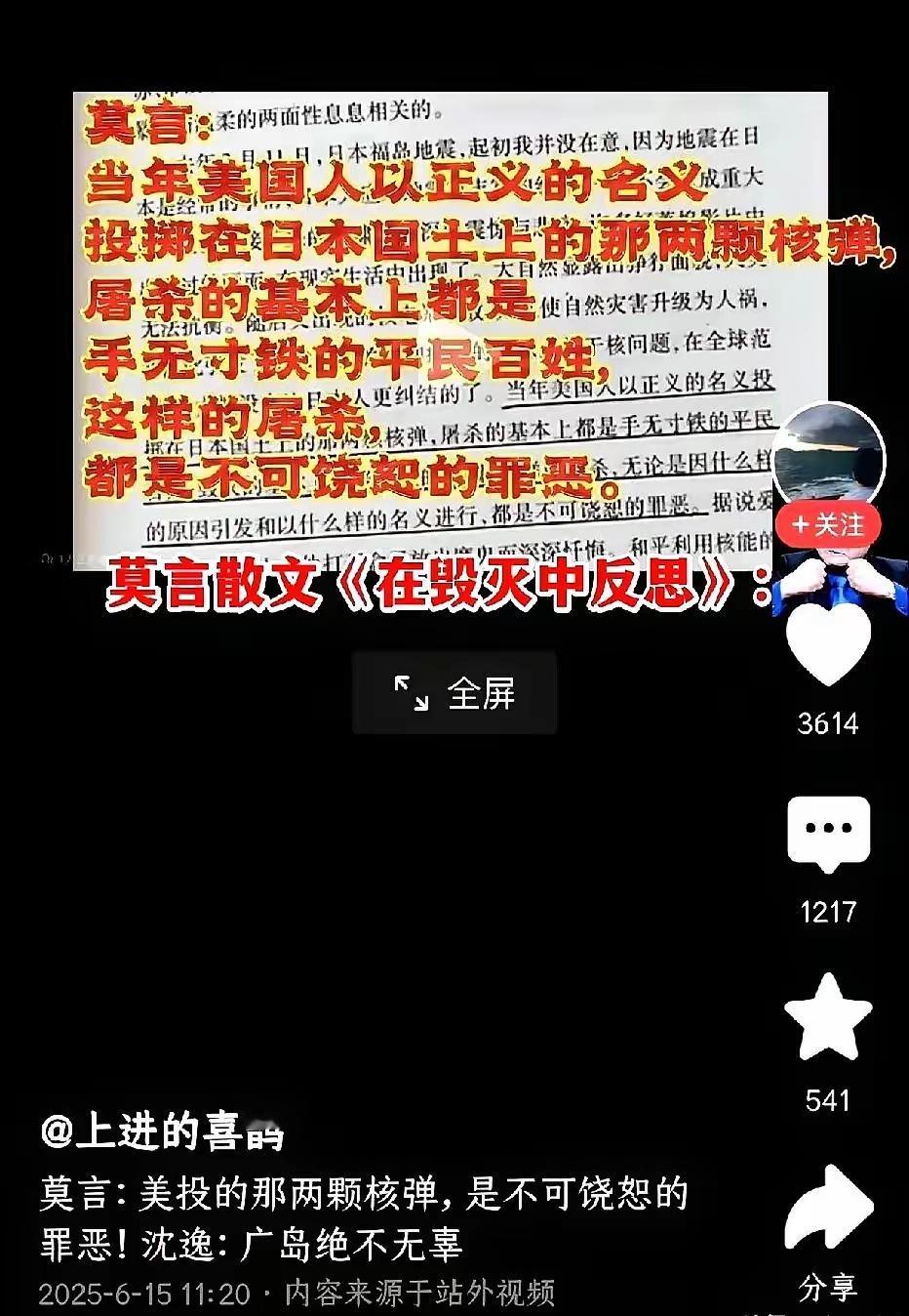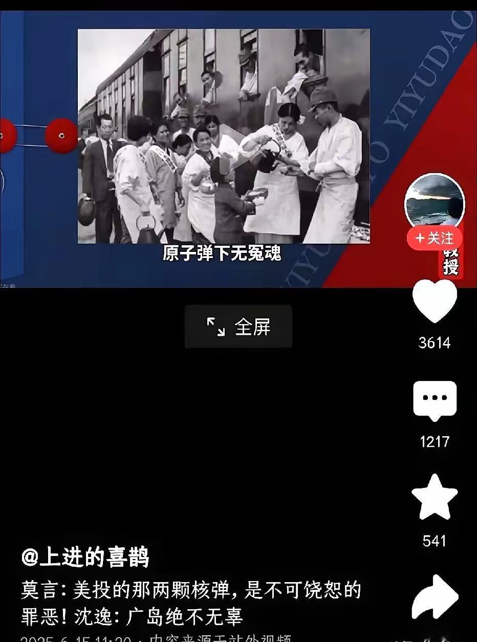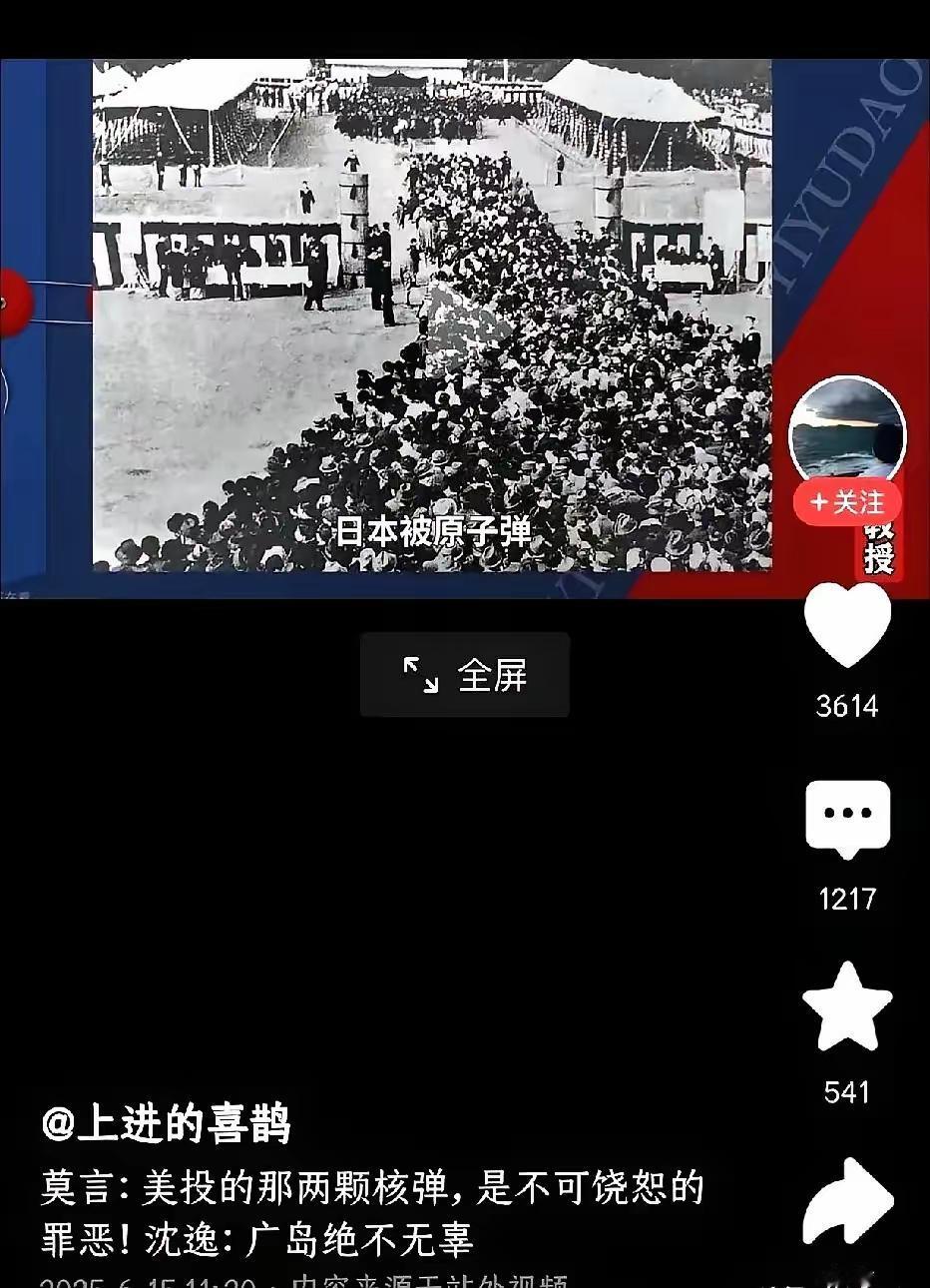 莫言核弹言论引爆争议 直言美国原子弹轰炸是“不可饶恕的罪恶” 诺贝尔文学奖得主莫言散文《在毁灭中反思》中一段话被翻出引发舆论地震。文中直指当年美国向日本投掷原子弹“屠杀的基本上都是手无寸铁的平民百姓”,并斩钉截铁判定“这样的屠杀都是不可饶恕的罪恶”。这段文字在历史爱好者社群中炸开了锅。 不少网友搬出历史档案反击:二战时期日本全民战争机器疯狂运转。从东京到乡村,庆祝攻陷南京的灯笼游行遍布街头;小学生课程表加入刺枪训练,妇女组织挨家挨户收集金属造枪炮;军国教育从娃娃抓起,儿童玩具都是坦克模型。更不用说数百万家庭送出儿子参军,无数商人捐款制造零式战斗机。当时日本本土六千万人,征兵总数超千万,真正意义上的“举国皆兵”。 历史学者指出,广岛当时是日本陆军第二大本营,拥有军港、兵工厂和四万三千守军;长崎三菱造船厂正日夜赶制军舰。原子弹落下前三个月,冲绳战役中日方强迫平民自杀殉国,平民死亡超十万人。有网友直言:“当整个国家变成战争怪兽时,每滴汽油都是鲜血染红的。” 莫言笔下“手无寸铁的平民”背后,是无数缝制军装的母亲、生产子弹的学生、捐献戒指的少女。东京大空袭幸存者记录显示,居民区地下室堆满军需品。这种“全民战争”语境下,“无辜者”界限早已模糊。 二战结束前日本本土仍在疯狂备战,强制征召包括老人儿童在内的国民义勇队。根据美军估算,登陆作战将导致数百万日本人死亡。原子弹造成约二十万人丧生,却避免了更惨烈的本土决战。 结尾锐评:当雪崩发生时,真的存在完全纯洁的雪花吗?在战争这个巨型绞肉机里,究竟该由谁来定义“无辜”?莫言的慈悲是否用错了地方?莫言感悟人生 莫言 莫言语录感悟 莫言文学 莫言精句 莫言精神 莫言名言