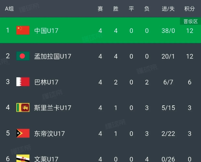 U17国足4场比赛狂轰38球,进球数超过了同组其他5支球队的进球总数。U17国足的统治力太强了,在亚洲足坛处于独孤求败的地位。 孟加拉20球,巴林6球,斯里兰卡5球,东帝汶2球,文莱0球,其他五队的进球总和是33球,比国足少5球。 整个U17亚预赛,U17国足的进球数也是最多的,比第二名越南多16球。