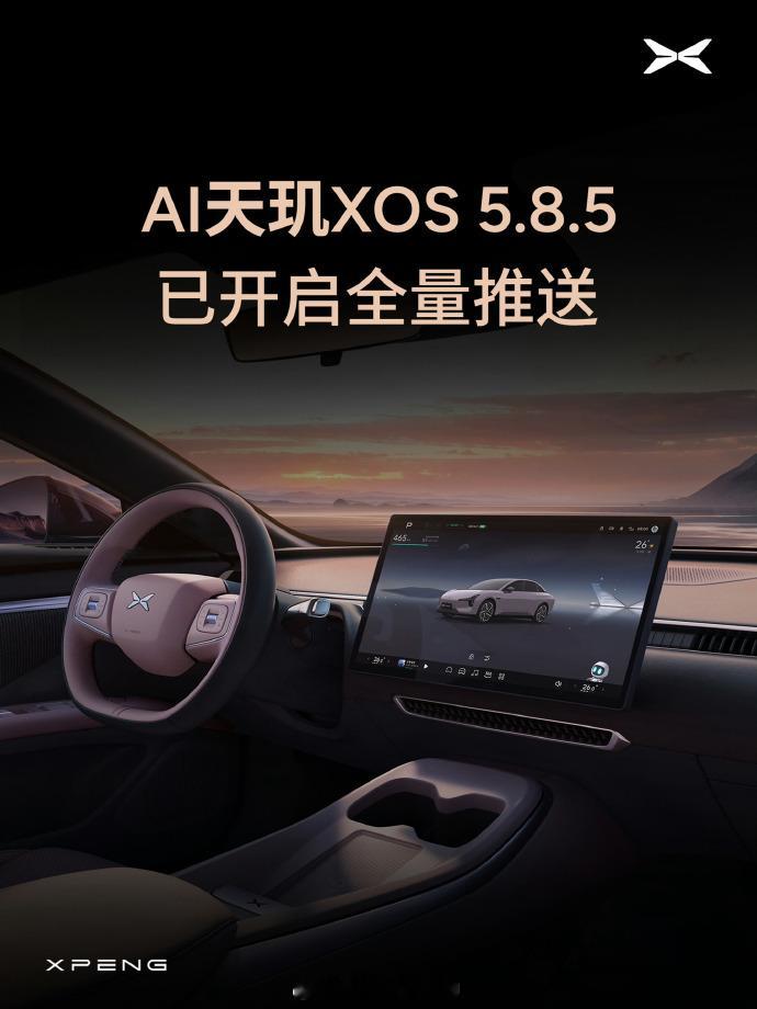 小鹏AI天玑XOS 5.8.5已于2025年12月3日开启全量推送适配车型涵盖P7i、G6、G9、X9、P7+、MO3、G7及新款P7等MAX版本主要升级包括:车位到车位焕新版、紧急转向避让AES、vivo手机镜像能力、离车舒享模式、智能出库提前准备、新增露营模式、AI智能音效、App实时行程数据小鹏OTA次次焕新车新能源汽车小鹏汽车