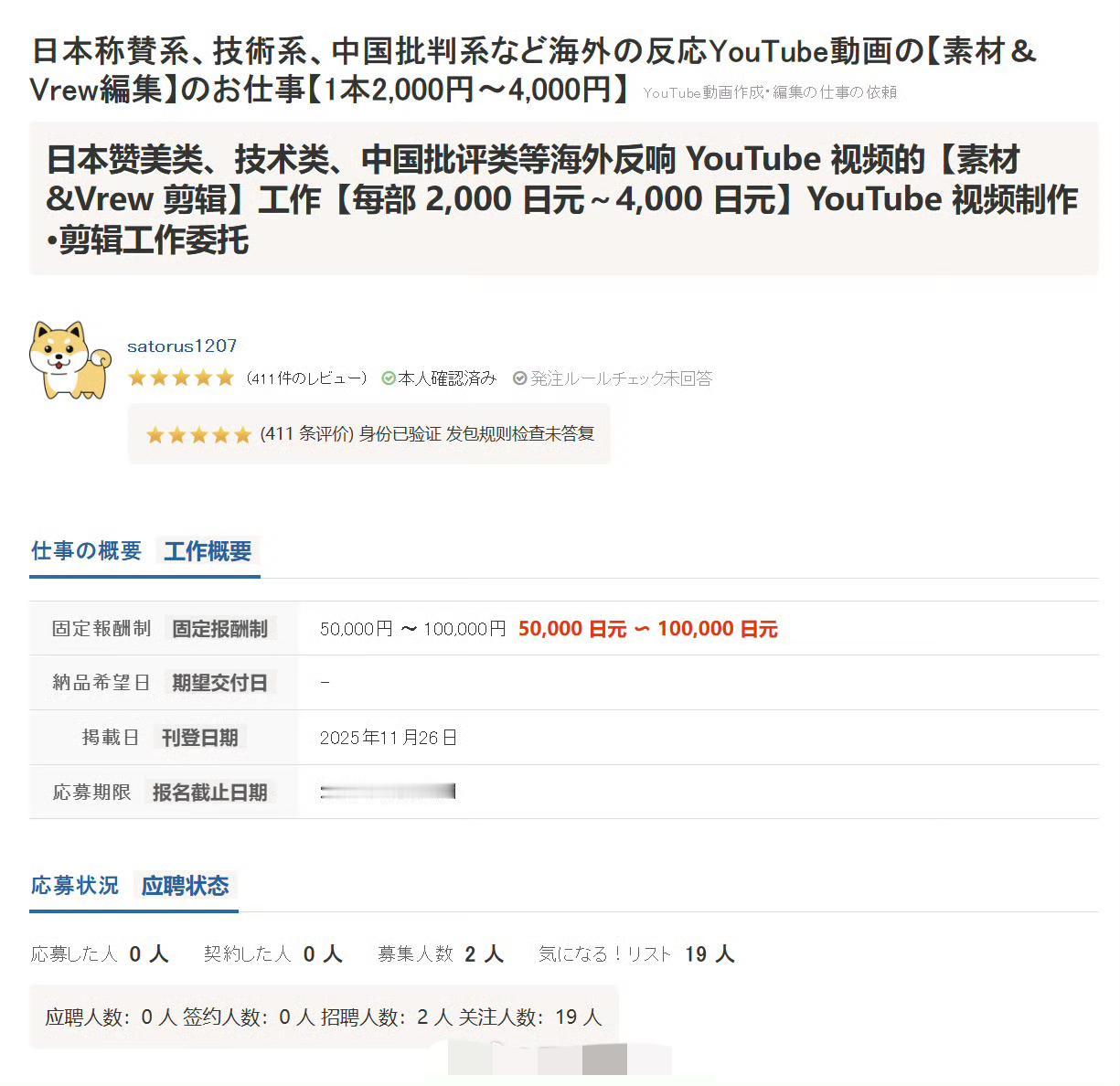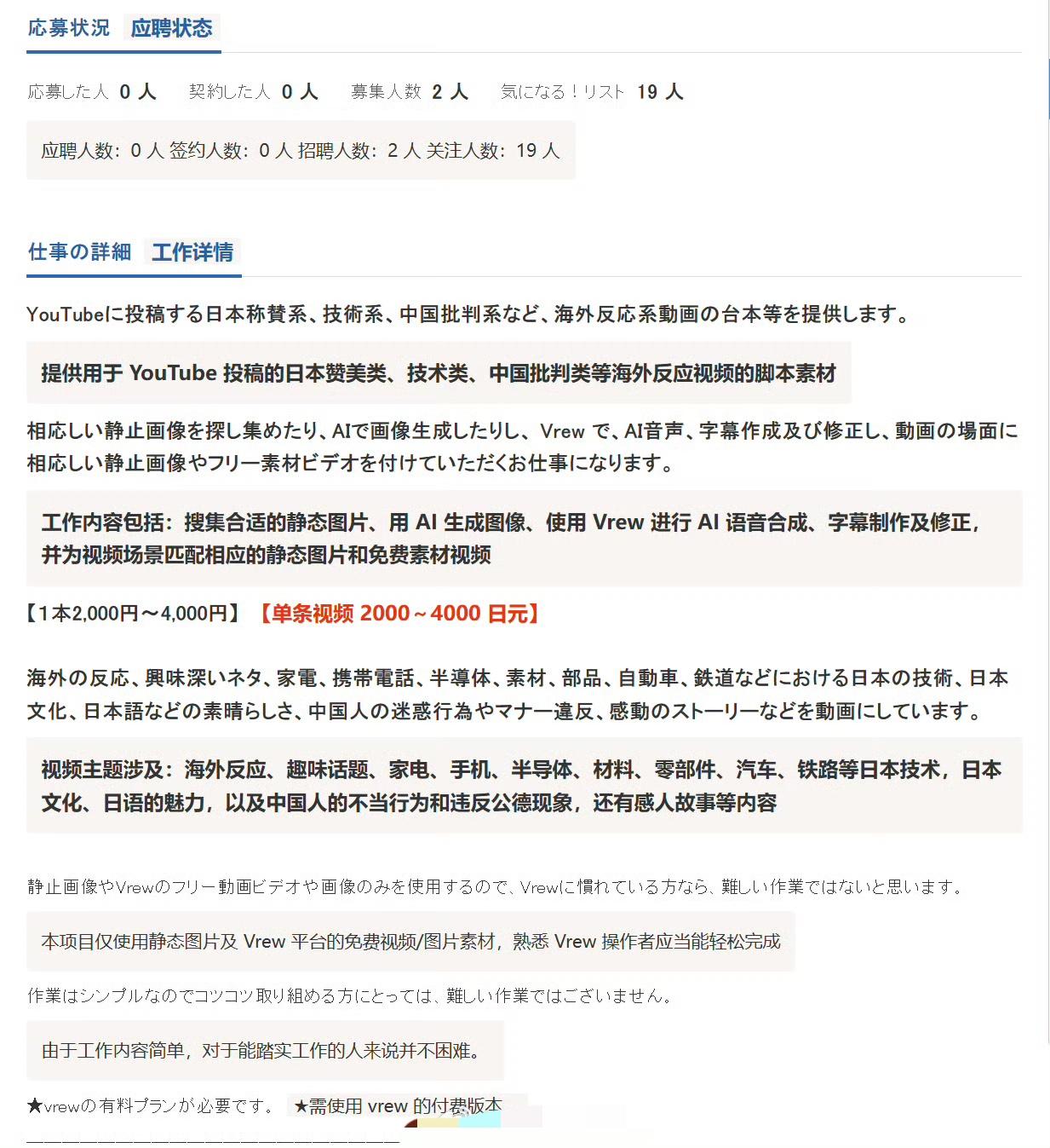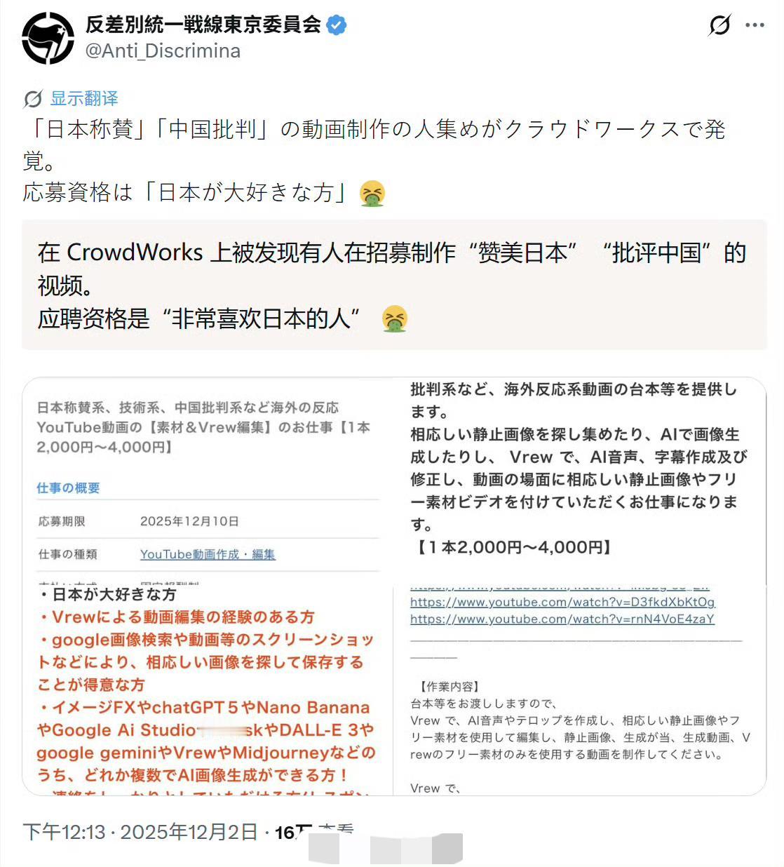 日本众包平台上有很多“批评中国,赞美日本”的招聘信息,一条视频是2000-4000日元(约90-181元)视频内容是夸赞日本的铁路、半导体、汽车、日本文化等等,批判中国人的违反公德现象 日本宣传的手段与美国如出一辙,以前可能有人相信,随着互联网的发展,很多外国网友把这种宣传成为“日本轴”