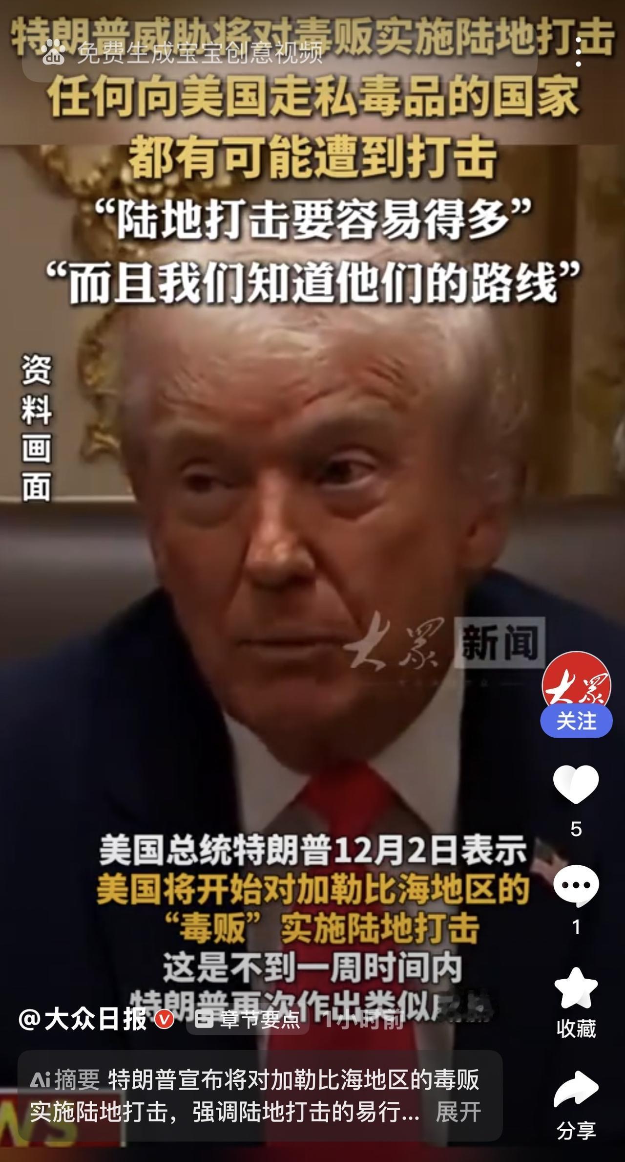 特朗普说,任何向美国输送非法毒品的国家都可能遭受陆地打击,“不仅仅是委内瑞拉”。 “我听说哥伦比亚在制造可卡因,他们有可卡因制造厂,然后把可卡因卖给我们。” 美国战争部长赫格塞斯12月2日坚称,美国打击涉嫌贩毒船只的行动“才刚刚开始”。 赫格塞斯说:“我们才刚刚开始打击贩毒船只,把毒品恐怖分子送入海底,因为他们一直在毒害美国人民。”