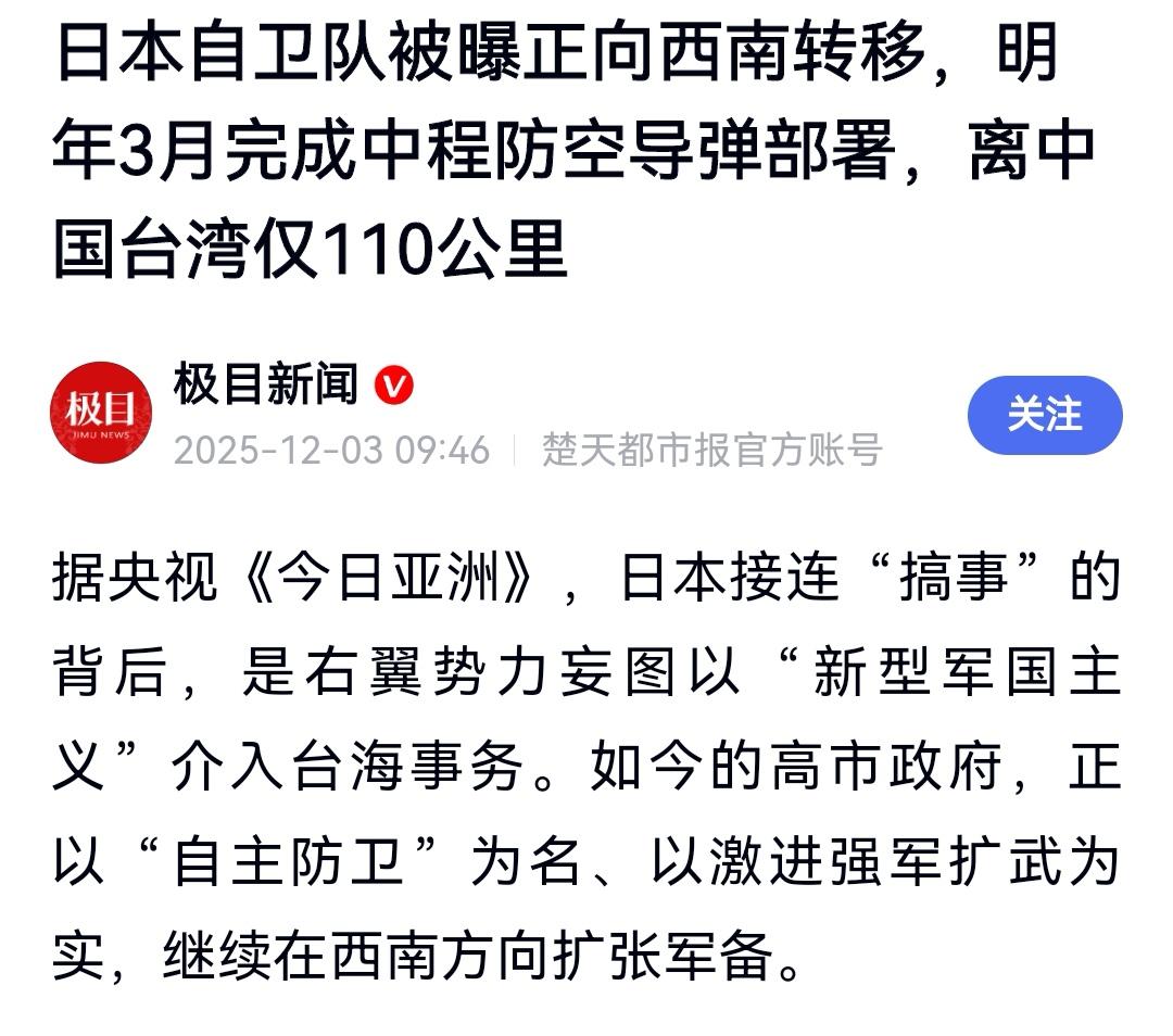 快讯!快讯! 12月3日,据《极目新闻》报道称,日本自卫队被曝正向西南转移,明年3月完成中程防空导弹部署,离中国台湾仅110公里。央视《今日亚洲》称,日本接连“搞事”的背后,是右翼势力妄图以“新型军国主义”介入台海事务。军事专家称:2016年至2024年,日本借“西南方向局势紧张”为由,花费巨资在西南诸岛进行大规模战备建设,使该地区迅速要塞化、军事化。 讲几句:不怕贼偷就怕贼惦记。日本自卫队西南方向转移,与高市早苗“台海出兵”错误言论不谋而合,拒不认错的高市无疑是对“军国主义”行径复活的宣告。 高市早苗作为军国主义罪犯后裔和安倍晋三幕僚,自上任日本首相就播下“罪恶”的种子,先是以“危机存亡”为借口,从“台湾有事就是日本有事”,到混淆视听搞“台湾地位未定论”,翻板了二战时借口侵略中国的做法,也为更大规模军事介入地区局势、突破战后国际体制埋下伏笔。 再以企图暗自修改和平宪章,提高防务经费,恢复大佐军衔,扩充武装力量,购置军火,挑起事端意图明显,提高战争准备症候明显。 士可忍孰不可忍,高市政权已经到了无可救药地步,必须运用政治、经济、外交、军事综合手段迎头痛击,坚决斩断军国主义九头鸟抬起的头颅。