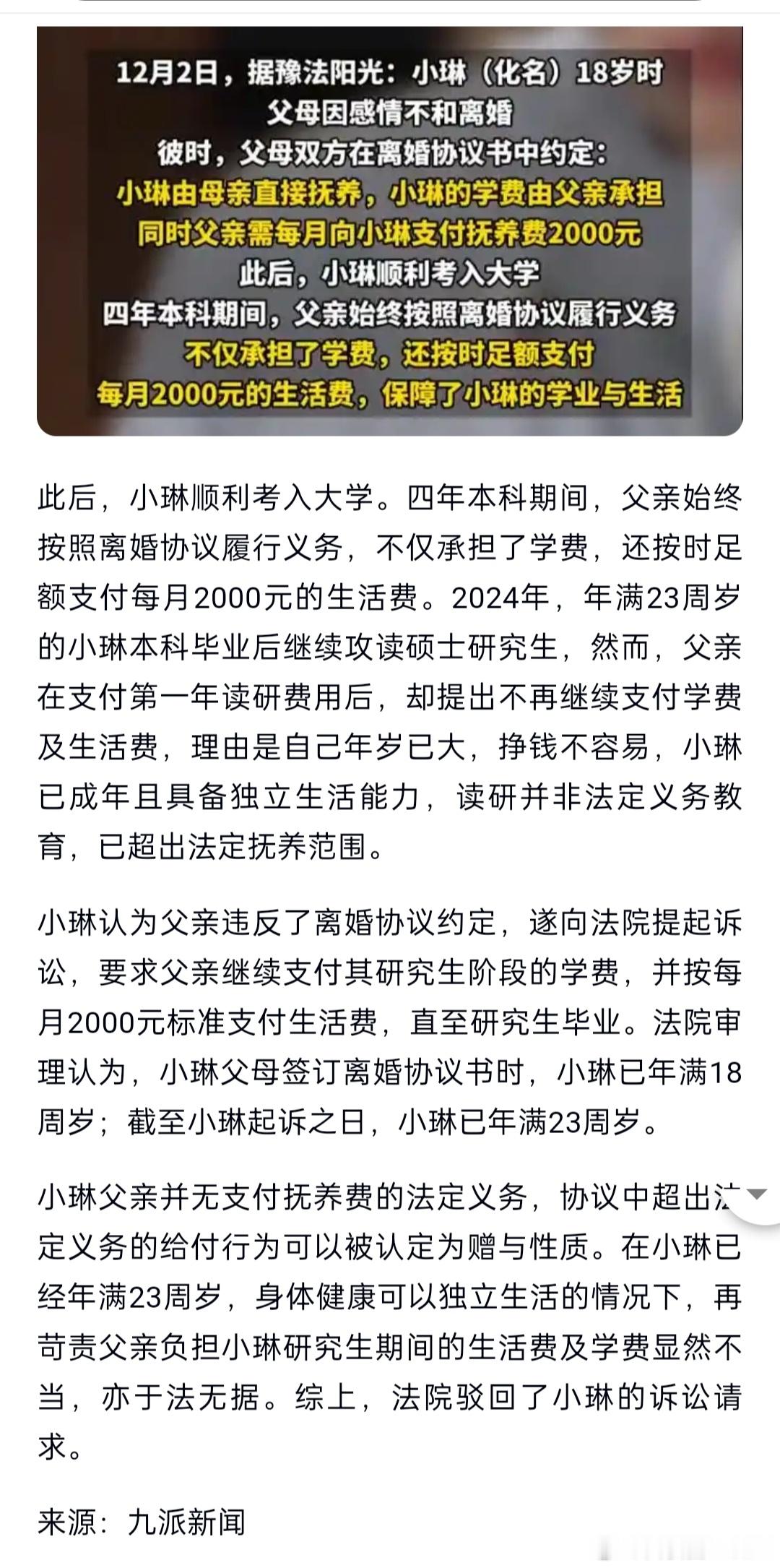 女儿诉父亲付研究生生活费被驳当初的离婚协议就是错的,帮别人孩子,给自己养仇人。父亲负责了孩子所有的学费,结果孩子在母亲的教唆下,孩子必然不感恩父亲的付出,认为爆金币是父亲理所应当的义务。