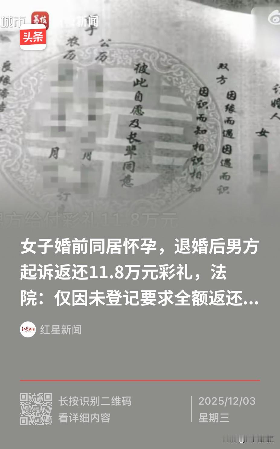江苏无锡,一男子和女友订婚后,两人便同居起来,期间,女友怀了孕,可是因为一些生活琐事,两人经常吵架,最终分了手,女友也做了手术终止妊娠,事发后,男子将女方告上了法院,要求全额返还彩礼。 据悉,王某和女子白某在24年2月订的婚,订婚后,王某支付了11.8万的彩礼,随后两人就在一起同居生活了,期间,白某也怀了孕,然而,因为在一起后,一些生活琐事让两人经常吵架,最终,两人分了手。 于是,白某来到医院做了手术,因为当时拿了十多万彩礼,也没有结婚,于是,王某将白某告上了法院,要求白某退还这11.8万的彩礼。 事发后,网友则表示,没有登记结婚在一起干什么,做手术是很伤害身体的,这笔钱不应该退,应该给女方弥补损失才对。 还有网友说,我们这里是谁提出分手,谁承担责任,比如男方提出分手,彩礼就不能要了,女方提出分手,就全额退彩礼。 也有网友说,反正我女儿结婚,我不要她彩礼,也不用男方名字加名字,不占男方家一点便宜,孩子跟我姓就行。 那么,从法律上来说,女方要退还彩礼吗? 王某与白某自二月订婚至分手,共同生活约四个月。在此期间,双方形成了事实上的家庭生活模式,共同承担生活开支,履行相互扶助义务。这部分共同生活的经历,使彩礼的性质发生部分转化。 而当双方关系恶化致分手并最终终止妊娠,由于双方关系已进入深度结合阶段,远超一般恋爱关系;另一方面,终止妊娠对女性身心健康造成的实质影响,构成了需要特别保护的法益。 所以,从这个角度来说,退还全部彩礼是不现实的。 其中,关于审理涉彩礼纠纷案件适用法律若干问题的规定第六条规定, 双方未办理结婚登记但已共同生活,一方请求返还按照习俗给付的彩礼的,人民法院应当根据彩礼实际使用及嫁妆情况,综合考虑共同生活及孕育情况、双方过错等事实,结合当地习俗,确定是否返还以及返还的具体比例。 因此,返还是一定要返还的,但是却不是全部返还,而是根据实际情况的返还。 本案中,法院最终按照孕育情况,共同生活等,判决白某返还4.7万元。 最后,这起案件对于即将步入婚姻的年轻人,此案也提供了一份启示,婚前充分了解彼此的生活习惯、价值观念,对婚姻保持理性预期,同时,对于彩礼等重大财产往来,可考虑通过书面形式明确性质,或保留相关凭证。更重要的是,当感情无法继续时,如何体面地处理好包括财产在内的一切关联,才是对双方最后的考验。 对此,你对本案有什么看法? —————————— 关注我,带你评析法律热点,关注冷暖人生。 文章原创,抄袭必究
