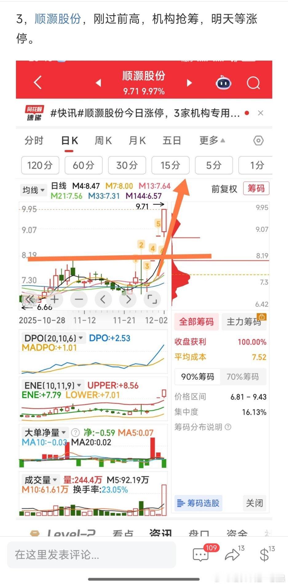 3,顺灏股份,刚过前高,机构抢筹,明天等涨停。昨天唯一大胆说“明天等涨停”