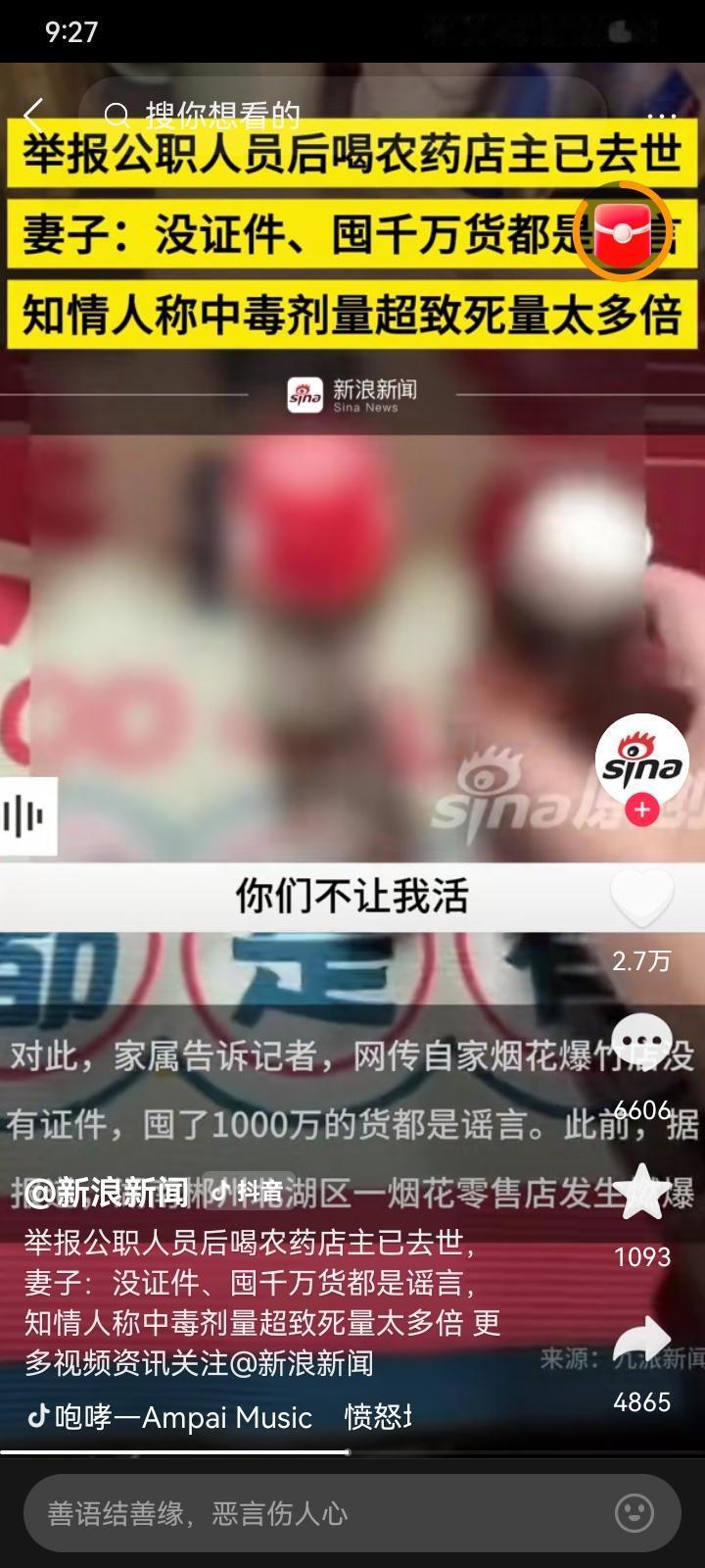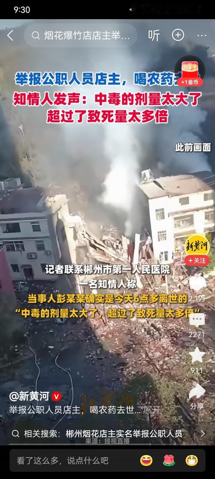 已经证实了! 湖南郴州,实名举报7名公职人员的烟花店老板已经去世了。他生前录的视频也曝光出来了!网友:老百姓一生只用一次的大招太惨烈了! “你们不让我活,那我就不活了呗!” 随着一声巨响,硕大的蘑菇云腾空而起,紧接着就是噼哩叭啦的燃爆声和烟花刺破长空的景象。 不过,这可不是庆祝喜庆的场面,而是一场决绝的与世界告别的画面。而面对这突然起来的爆炸,周围的车辆被掀飞、对面居民楼玻璃被震碎,3个人员还受了伤。 闹出这么大动静的是什么人?他又为什么要这么做? 原来,39岁的彭某是湖南郴州一个烟花店的老板。根据之前的一段曝光出来的视频显示,彭某说自己是合法经营,证件齐全,而且都在有效期内。 但是,街道办、应急管理局、派出所、城管等7名公职人员多次向自己索要财物,拿烟花不给钱,而且自己提交的经营许可证迟迟没有办下来。 彭某发视频说:你们让我们关门我们就要关门啊,你不让我活,那我就不活了呗!随后彭某还疑似饮用“敌草快”轻生。房子也炸掉了! 但就在今天早上6点多,经官方通报,彭某因为抢救无效去世,现在遗体已经送往了殡仪馆。医院的结论是:中毒的剂量太大了,超过致死量太多了。 随后彭某的兄弟发文悼念他:你的两个儿子我会像自己的孩子一样照顾,让孩子健康快乐成长。下辈子我们还做好兄弟。 彭某妻子也发声表示:我们这种店铺,如果没有证,是无法经营的。网上传言囤1000万的货都是谣言。不批的理由是说空气质量不达标。 现在此事还在调查之中,至于彭某举报的7个人员都是谁,又到底有没有不正当操作,则要等待进一步的调查结果了。 不过,看到此事,看到一个人的命就这么轻易的从这个世界消失了,还是挺感慨的。 有网友说:普通老百姓真的太不容易,老老实实做点事儿,七卡八卡的,关键是有时候送了礼也不一定能办成事儿。还受一肚子窝囊气,委屈也没处说。 更有网友表示,这可能就是浪浪山里说的普通人一生只能用一次的大招!认为烟花店老板这是拿命在维权,非常同情烟花店老板。 还有的说,有些人就是拿着自己手上那仅有的一点官威去为难别人作贱别人。正如冯唐说的:人性最大的恶,不是贪婪,不是虚伪,不是自私,而是在自己能力范围内最大程度地为难别人。 好像这些人不这样做就显示不出来自己的价值和存在感! 这真的是一个令人心碎的悲剧。 彭某以极端的方式结束了生命,即便最后证明他是无辜的,可留下两个年幼的孩子,让一家人陷入无法愈合的痛,这种痛苦和折磨该如何平复呢。 而面对权力的冷漠与刁难,我们作为普通老百姓常感渺小无力,但又能如何,只能期待政策透明,执法公平公正。 我们痛恨那些滥用职权、以权谋私的人,更痛惜一个鲜活生命的逝去。 最后愿真相早日查明,还他公道,也愿这样的悲剧不再重演。