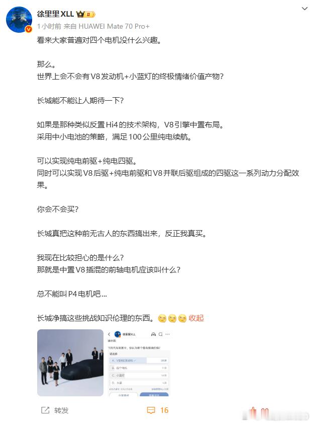 你这是想要法拉利SF90,兰博基尼大牛的加大电池版本吗?V8发动机+P2+P4*2两台车都是前置两个P4电机,后轴内燃机+P2电机只不过纯电续航非常短,电池容量其实并不主要为了纯电续航,SF90电池容量大约为7.9度电,做到7.9度,其实是为了能够爆发足够的功率。如果长城选择V8发动机+P2+P4做超跑,可以利用国内的动力电池强项,把电机功率做的更高一些,电池放电功率也做得更高一些。但作为超跑,也不会大太多,否则电池充放电无法的刷圈中平衡,无法做到持久的快