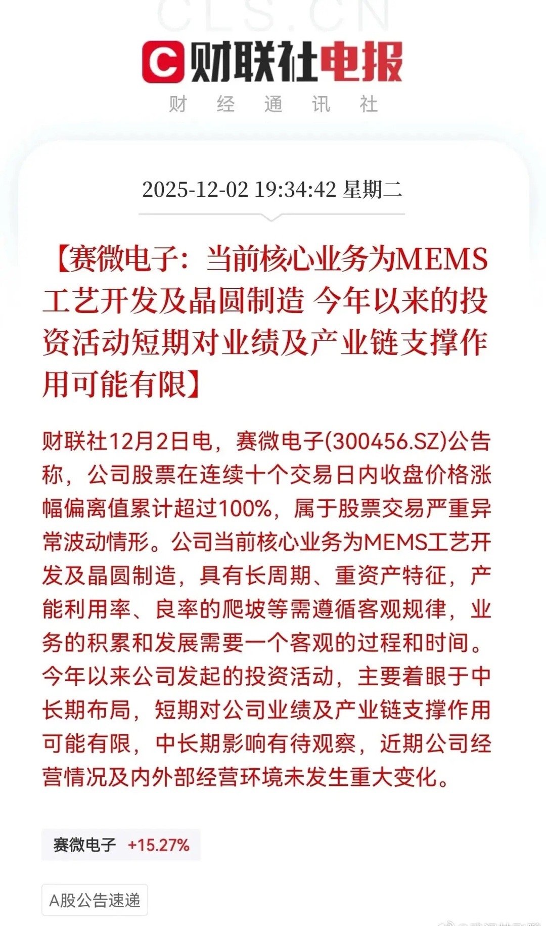 发证了,发证了,发通行证了,赛维同学今天成功领证,领就领了吧,还在标题上说当前核心业务为MEMS工艺及晶圆制造。接着又来一句,今年以来公司发起的投资活动,主要着眼于中长期布局。你就说你什么意思吧,隔壁都开始说再涨就要申请停牌了,你只字不提就罢了,还说的这么详细,你是生怕大家不知道你核心业务是什么吗?不过从理性方面去看待,还是要注意风险的,别的就不说了,林飞鹏现在只提示风险,不再说对标哪个了,毕竟风险是涨出来的。不是吗?