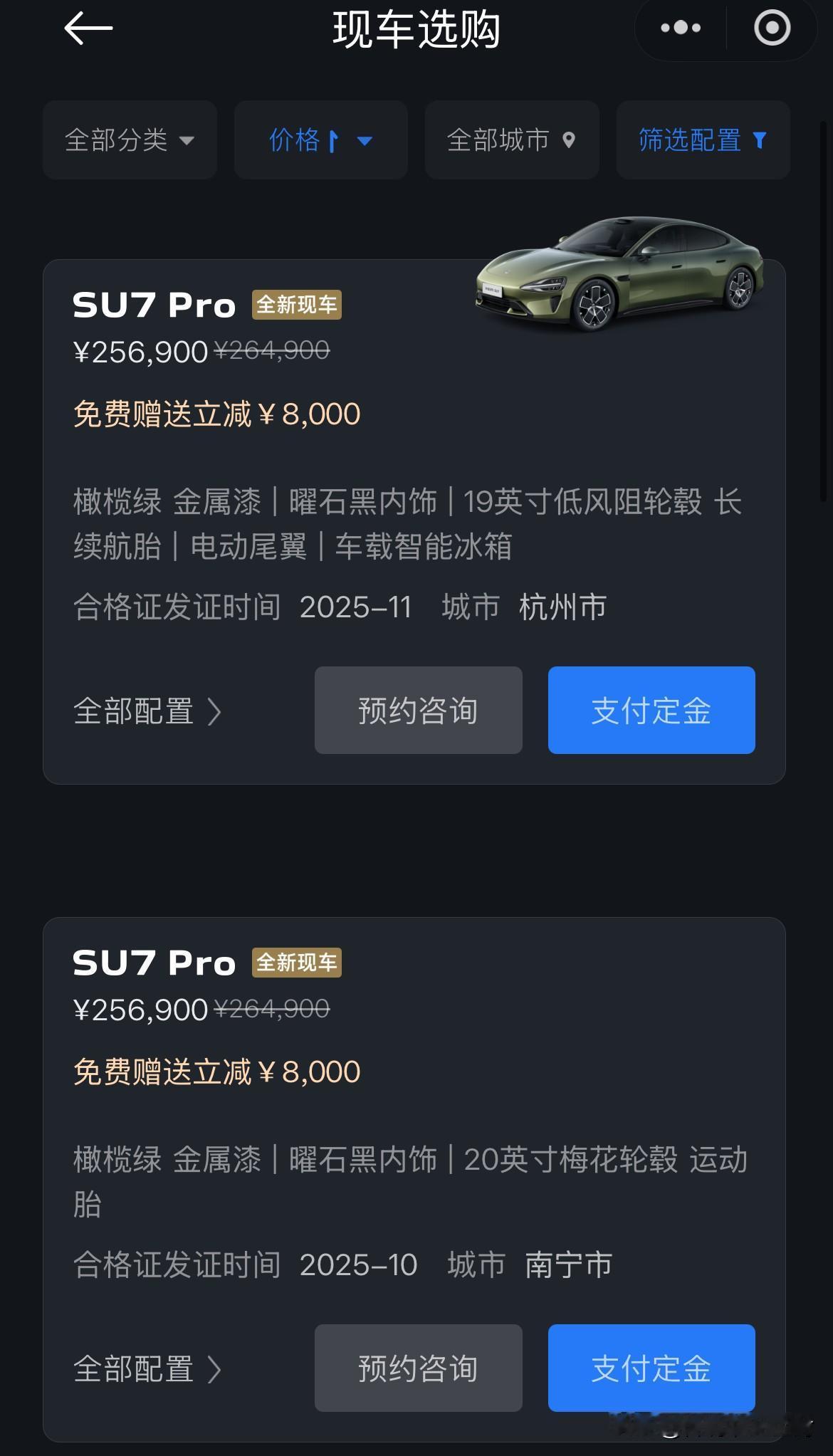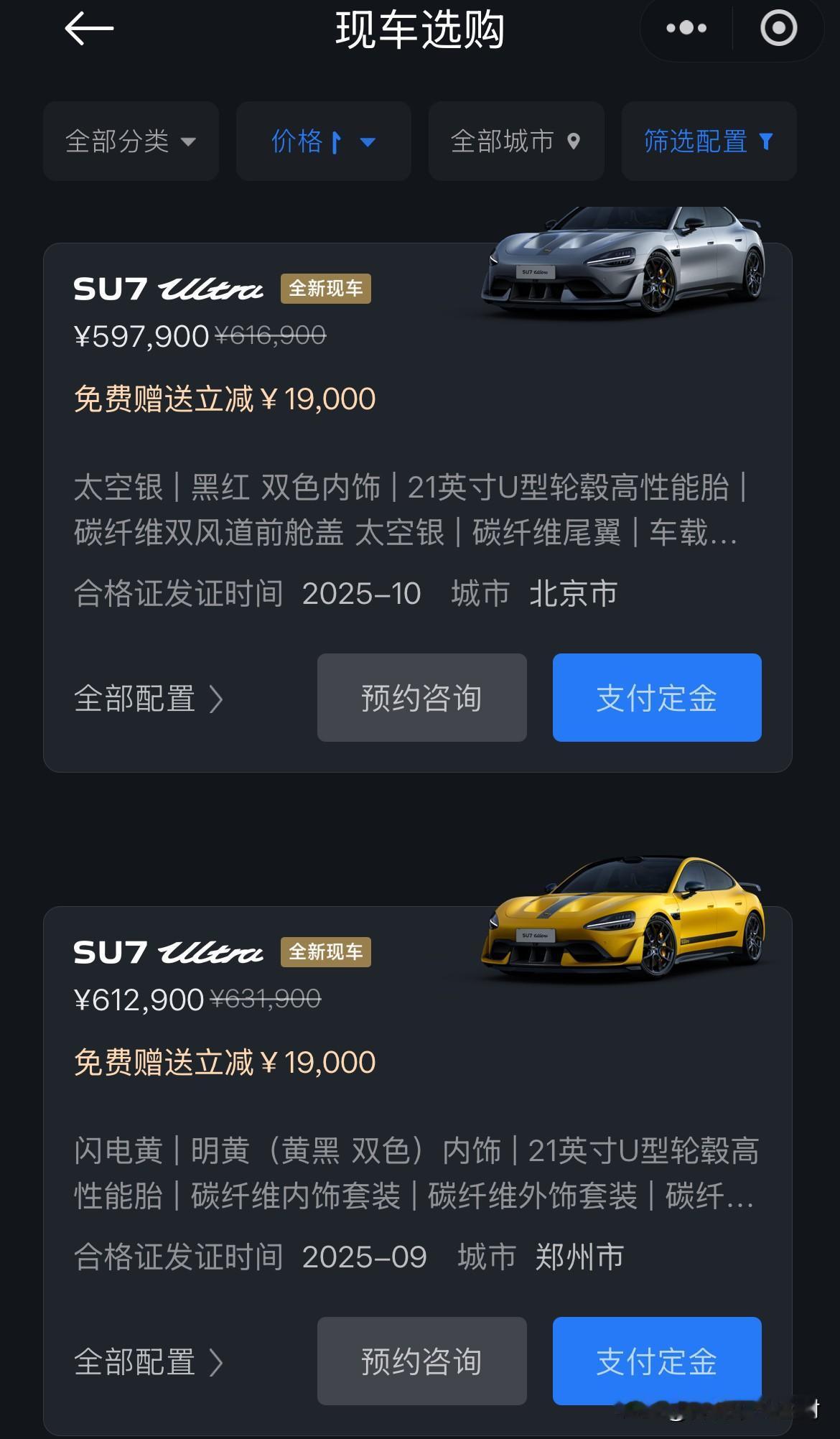 小米开放现车选购。 看了下,YU7、SU7和SU7ultra都有,不过都是全新车、偏高配车型,估计展车什么的因为更有价格优势,已经被选完了。 不过即便是全新车,也都有一定程度的“免费赠送立减”,而且也不仅仅是锁单用户可选,年前不想等车的,感觉全新现车应该更有吸引力。 小米这点做的真的蛮好,一切都非常透明,价格、配置、合格证的发放时间,甚至在哪个城市显示出来,其他品牌这一般都是要员工才能看得到的详细资料…… 你对小米这波现车选购怎么看?