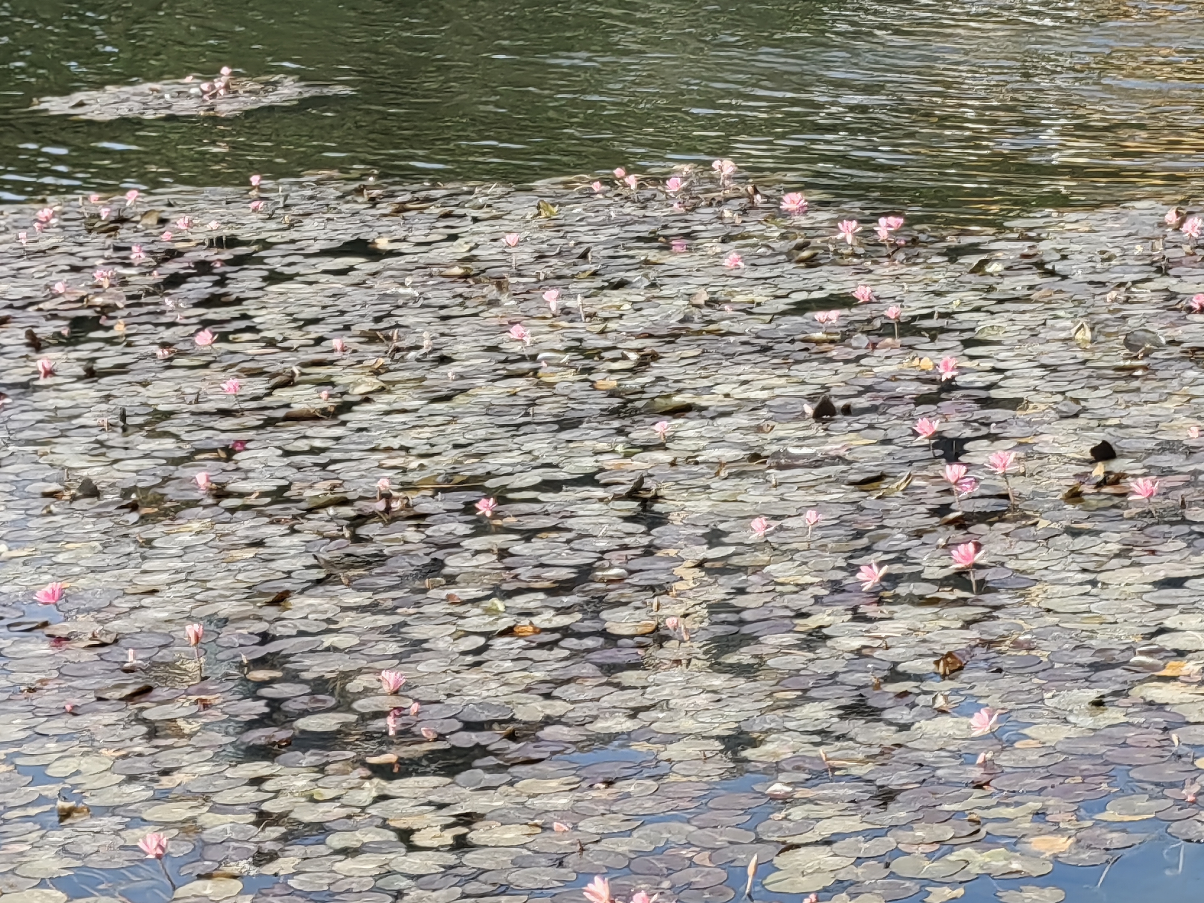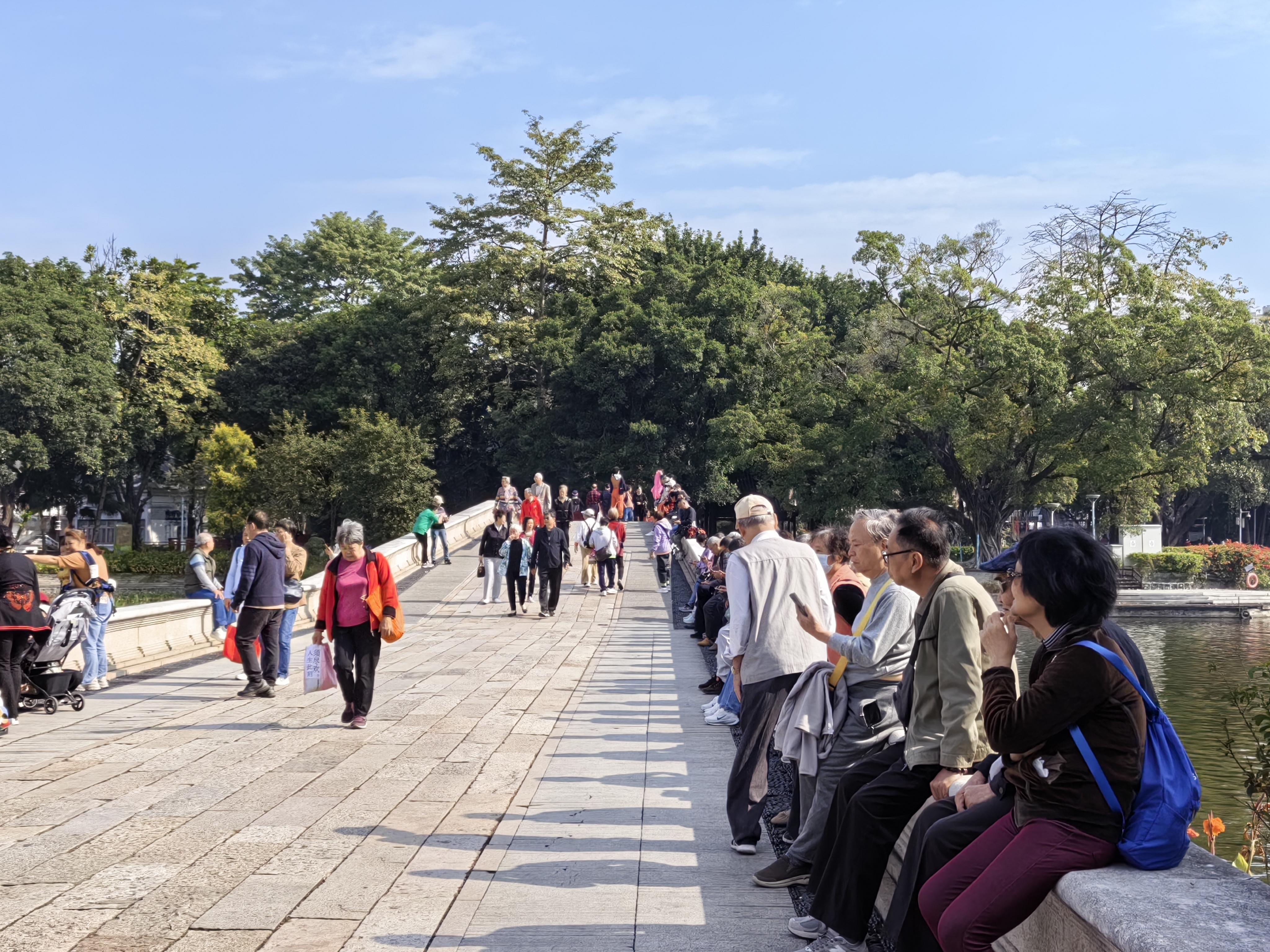 路过拱形桥时,我目睹了一幕奇特景象。一排老人坐在桥边晒背,彼此素不相识,却紧挨着落座。有人在闲聊,有人在看手机。暖融融的阳光洒在背上,眼前的湖面荷花盛开,满目皆是美景。