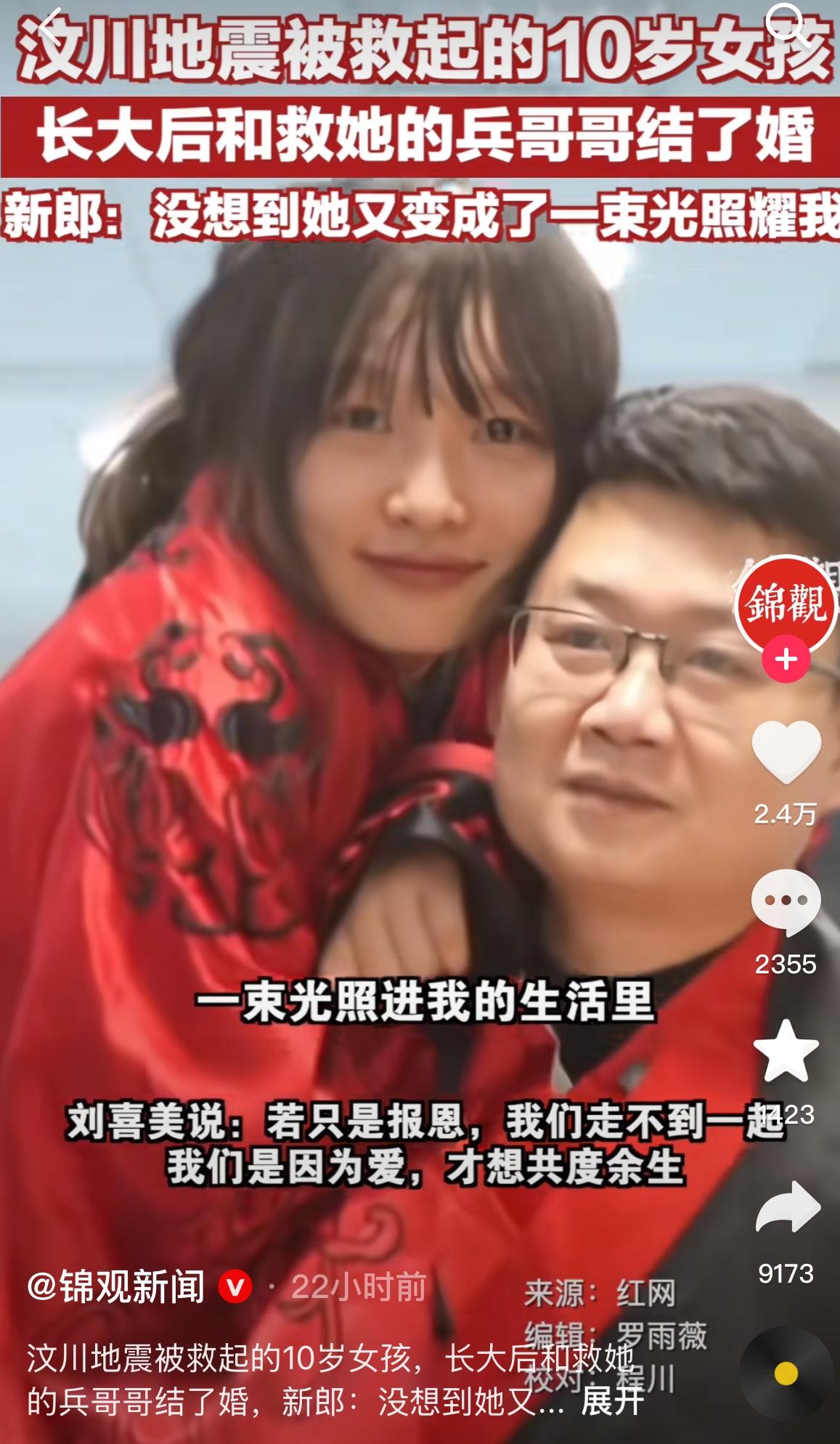我的天!08年地震,22岁的兵哥救了个10岁的小姑娘,谁能料到,这一救竟救回了自己的新娘! 俩人差12岁,当年一个是冲在前线的救人英雄,一个是惊魂未定的小丫头。时隔12年,2020年在长沙街头偶然碰上,兵哥一开始就把她当亲妹妹疼,可处着处着,越看越对眼,就这么谈了5年恋爱,最近刚办了婚礼! 有人说这是“救命之恩以身相许”,我觉得根本不是啥报恩!这就是缘分到了挡都挡不住啊!当年的一双手是救赎,后来的陪伴是真心,跟偶像剧里演的不一样,这是实打实的温暖,是历经岁月慢慢熬出来的感情! 不是所有相遇都能成偏爱,你说这种跨越了时光和劫难的爱情,是不是最让人觉得靠谱又好磕?