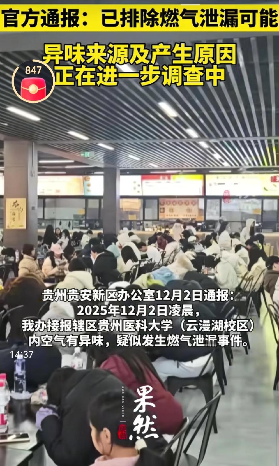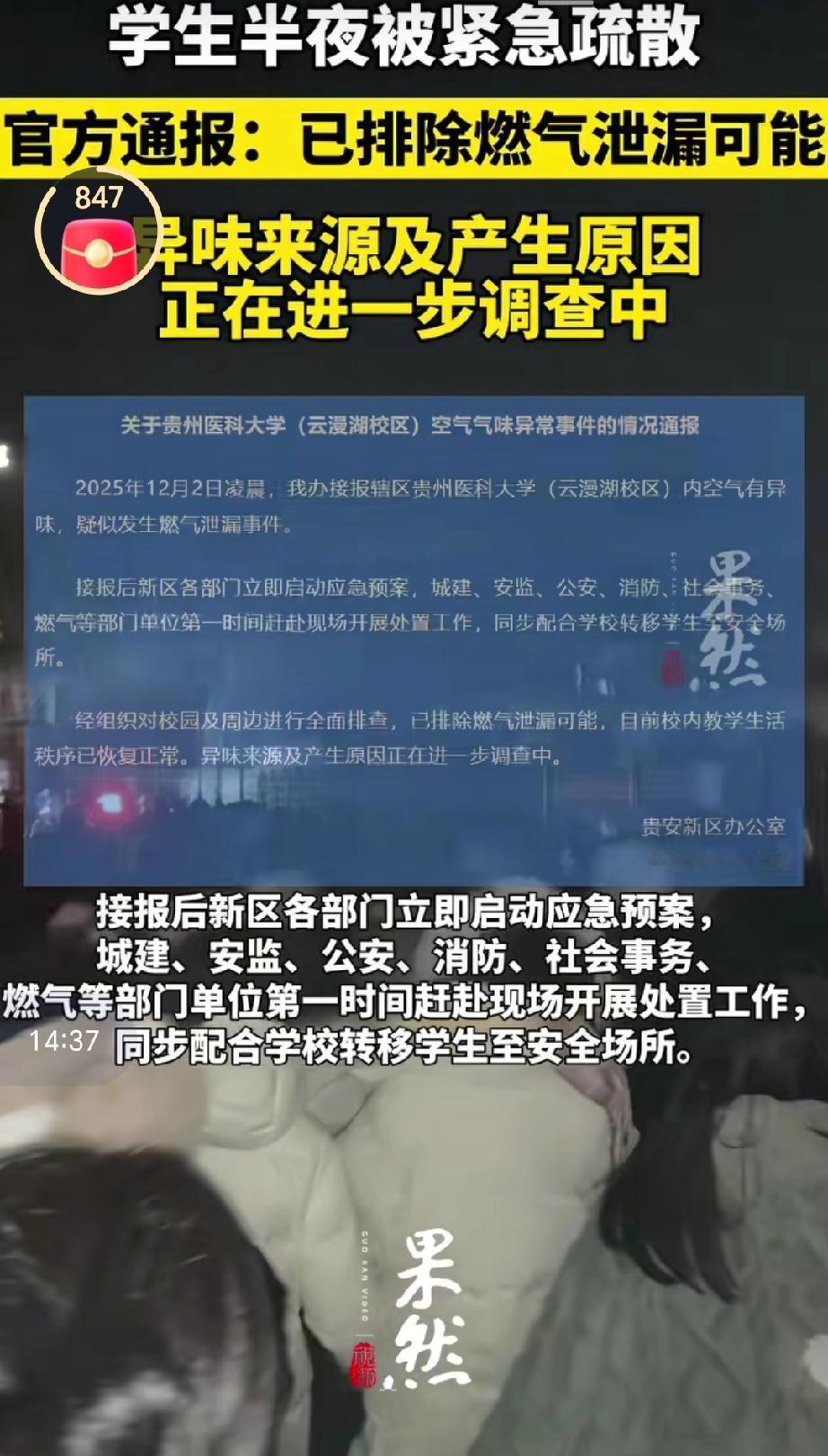 贵州医科大学(云漫湖校区)2025年12月2日凌晨因空气有异味,学生被紧急疏散。官方通报称,已排除燃气泄漏可能,目前校内教学生活秩序已恢复正常,异味来源及产生原因正在进一步调查中。事件发生后,贵安新区城建、安监、公安、消防等多部门第一时间赶赴现场处置,配合学校将学生转移至安全场所,并对校园及周边进行了全面排查。(来源于@齐鲁晚报·果然视频)