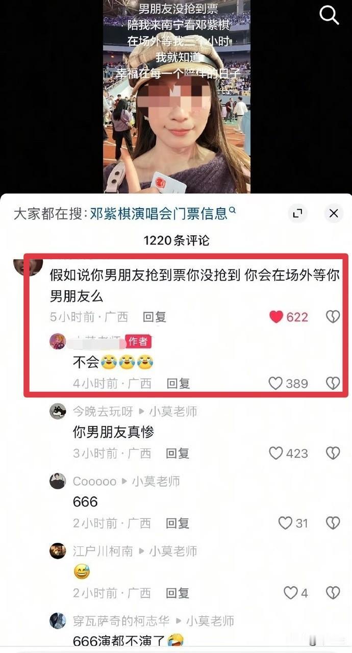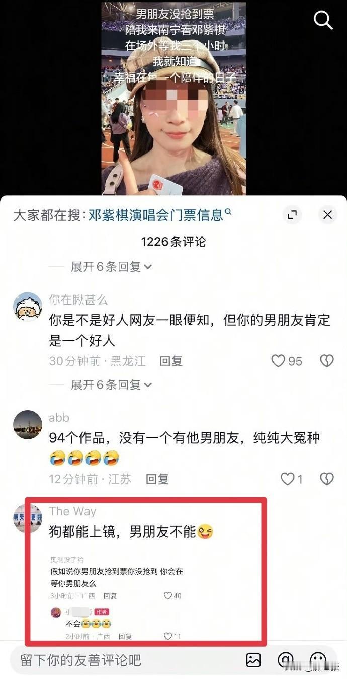 女子发帖称:男朋友没抢到票,陪我来南宁看邓紫棋在场外等我三个小时! 当网友问如果他男友抢到票,她会不会等男友时,无数的男性同胞破防了。。。 看到他在帖子下方回应:不会!真的是太扎心了!爱不是应该双向奔赴吗? 有细心的网友看到她的主页介绍里没有男朋友任何描述,但是却有“中华田园犬”,说狗都能上镜,男朋友不行!