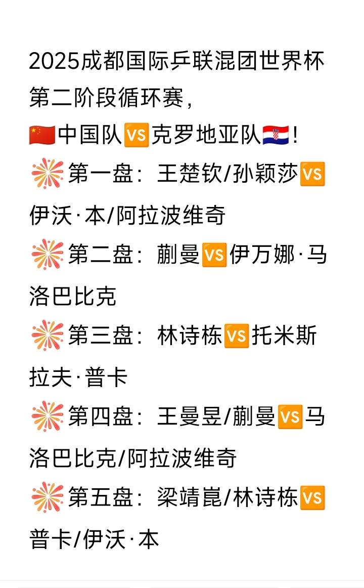 王楚钦/孙颖莎首盘将再次上场[奋斗]! 林诗栋将对阵普卡🇭🇷! 2025成都国际乒联混团世界杯第二阶段循环赛,🇨🇳中国队🆚克罗地亚队🇭🇷,双方排兵布阵如图所示。 第一盘中国队依然派出了王楚钦/孙颖莎组合出战,预计两人将3-0拿下。 第二盘由蒯曼上场迎战克罗地亚无名之辈,预计依然会3-0完胜。 第三盘:林诗栋迎战克罗地亚名将普卡,如果前面我们如愿得六分,那么这一盘林诗栋只需要胜两局即可[奋斗]! 昨晚国际乒联连夜修改规则,增加双打项目的场边指导,今天中午一点,肖战指导将会出现在场边[笑哭]。 小伙伴们一起观赛哦!