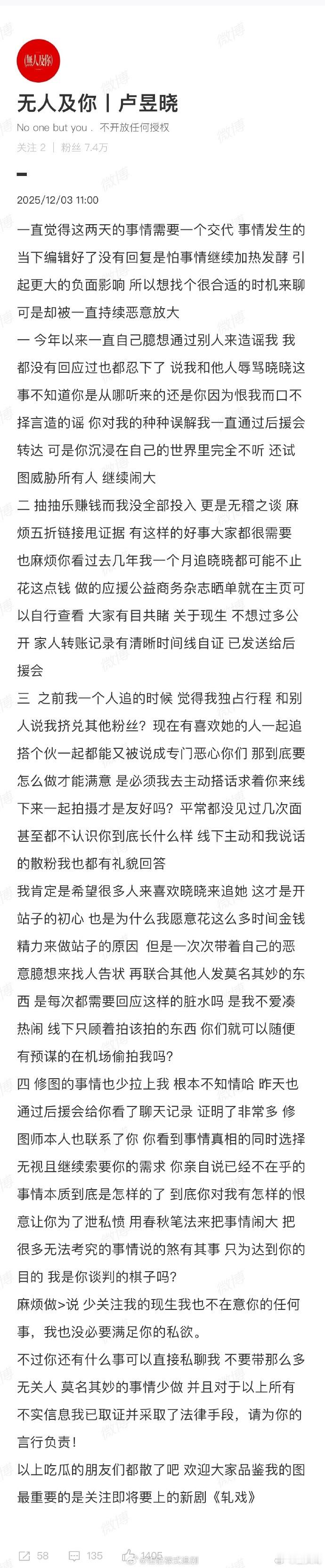 卢昱晓站姐无人及你发长文卢昱晓站姐回应私联 12月3日,曝卢昱晓工作室私联站姐引发热议。被曝私联的站姐发长文回应,称对于以上所有不实信息已取证并采取了法律手段。