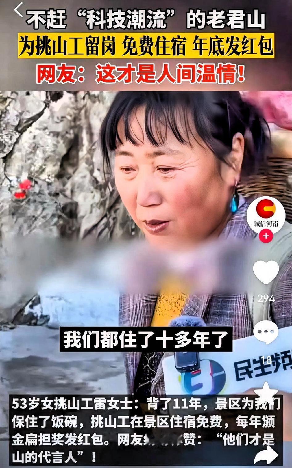 1. 解挑山工后顾之忧:山上的37名挑山工平均年龄52岁,大多没高学历和其他谋生技能,挑山是全家生计支柱。免费且水电全免的住宿,让他们不用为住宿开销操心,像53岁的挑山工雷玉琴已在此住了近十年,这份稳定让她安心工作,还带动侄女和妹妹也加入挑山队伍。 2. 彰显景区的责任担当:景区本可改用无人机运货每年省30万成本,却坚持不用机器取代挑山工,还主动提供住宿等福利。这体现了景区不唯“经济账”只算“人情账”的态度,没有把挑山工当成单纯的劳动力,而是真正体谅他们的辛苦,用实际行动守护劳动者的尊严。 3. 实现景区与挑山工双向成就:这些挑山工经景区培训掌握基础急救知识,既能给游客指路、提醒路况,还会顺手捡垃圾,成了景区的“活名片”和“山间安全员”。而住宿等福利让挑山工有了归属感,更愿意用心为景区服务,这种双向奔赴让老君山除了自然风光外,更添了打动游客的人文魅力。 4. 传递温暖的社会示范:在科技追求高效的当下,很多行业用机器替代人工,老君山的做法恰似一股清流。它证明科技并非要淘汰人力,发展也能带着弱势群体前行,这种重视劳动者、留存人间烟火的理念,给其他景区乃至更多行业都树立了很好的榜样。