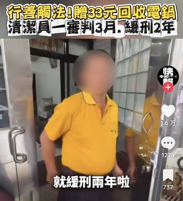 台清洁工在垃圾桶旁捡到一个废弃的电锅送人被判3个月缓刑两年,这个电锅价值才33台币,清洁工看到老太太一个人住孤苦无依,便好心把自己捡到的电锅送给对方使用,没想到却以盗窃为由被捕,并被判刑3个月,出来的时候他刚好退休了