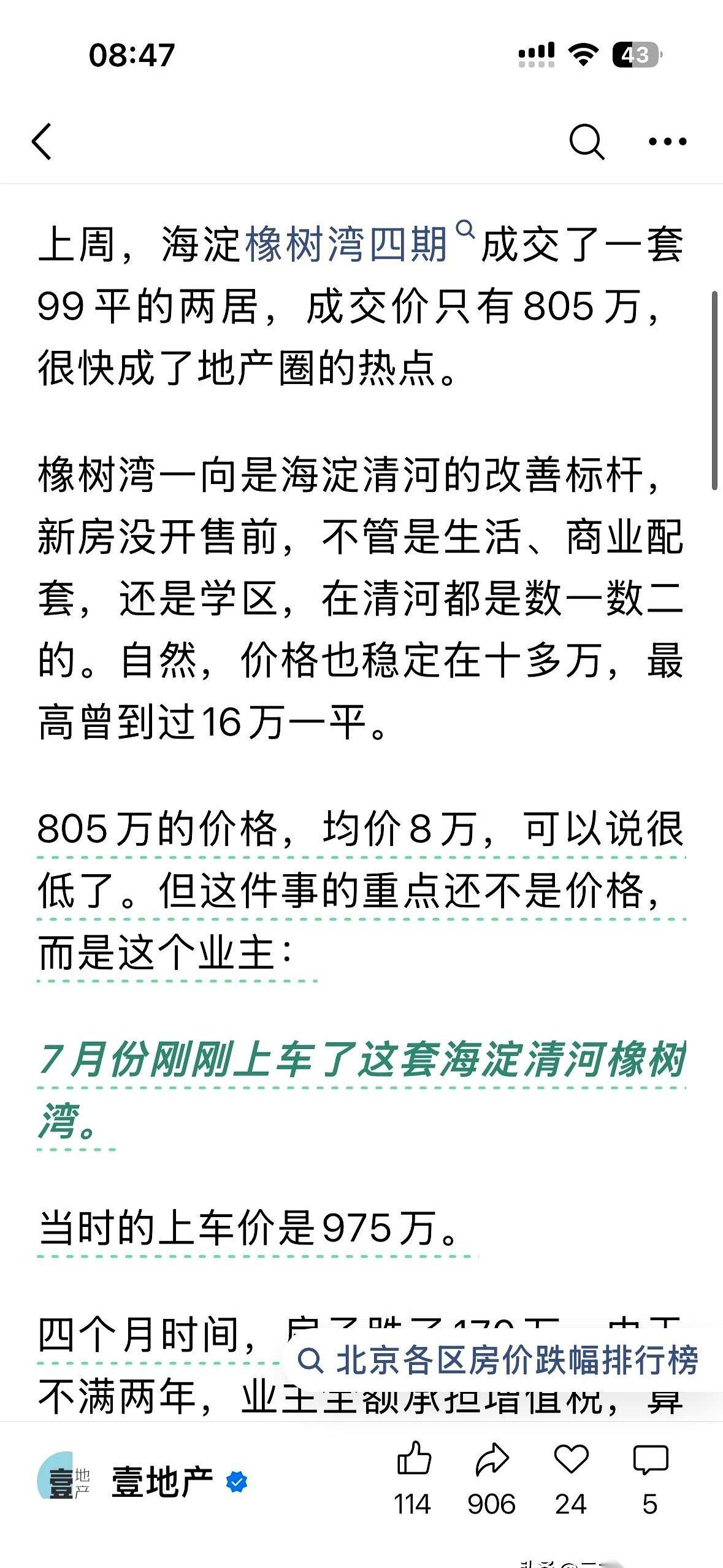就俩月,100多万,没了。 北京海淀的房子。7月刚上车,9月就割肉离场。 我勒个
