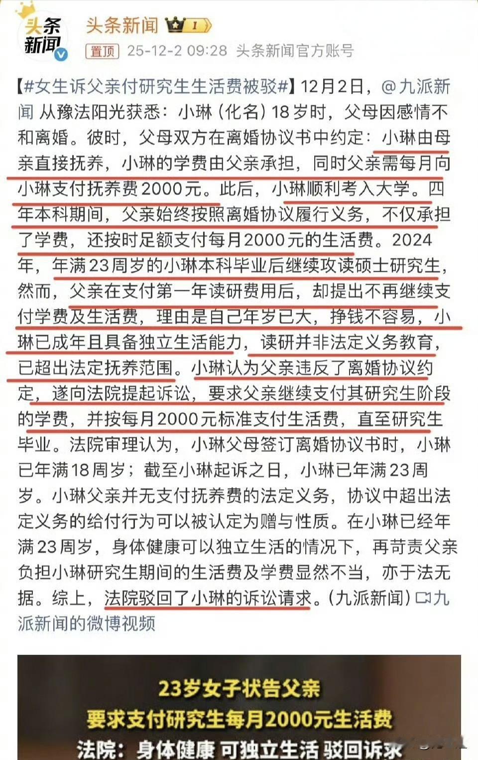 这个案子看得我牙根痒, 就连女法官都看不下去了, 没想到父亲的尽责,换来的却是女儿的起诉书。 其一,这个女儿已经23周岁了,完全有能力独立生活了,自己工作挣点钱不行吗?难道想在家吃父母,在外吃男友,婚后吃老公? 其二,按理说,抚养费应该是每个月父亲拿出2000,母亲拿出2000,一个月4000给女儿,这个案子估计只有父亲每个月拿出2000,母亲美美隐身了?恐怕母亲只是有抚养权,并没有给女儿抚养费吧。 虽然家庭离异了,但父亲辛辛苦苦养大女儿,换来的却是一张起诉书,当爹的得多寒心!!而且这个女儿丝毫不会感激父亲之前的付出,只会恨父亲没有托举她继续读完研究生。 这种研究生到底研究了个啥?人情不通,事故不懂,恩义全无。是谁把她培养成这样的呢? 真是养个葫芦也比养她这么个玩意强[发怒]