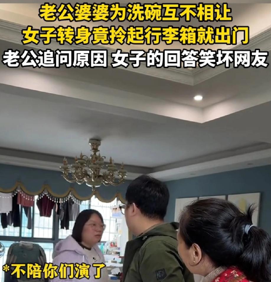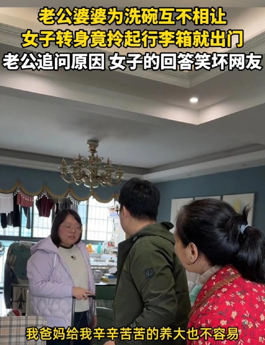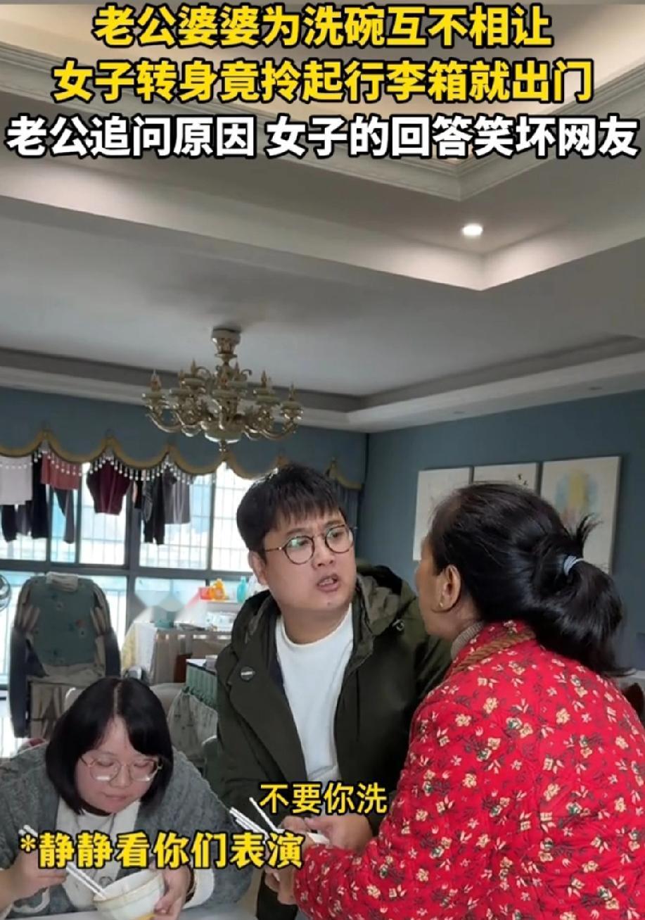 湖南,老公婆婆为洗碗互不相让,女子看不下去了转身竟拎起行李箱就出门,老公追问原因,女子的回怼太赞了! “我回娘家,我爸妈给我辛辛苦苦的养大也不容易,我回娘家洗碗!” 两母子搁这唱双簧,就是提醒儿媳妇去洗碗。就应该这样,干得漂亮!儿媳妇一在,老公婆婆就相互不容易,儿媳妇走了,老公婆婆就容易了。 婆婆养老公这么多年,怎么都没觉得不容易,结婚了就突然觉得不容易了,这儿媳妇娶的是治病的?有这推托的时间,早洗碗了,洗个碗都八百个心眼,演来演去的,不累吗? 这回好了,儿媳妇回娘家了,老公和婆婆就不用演戏了。