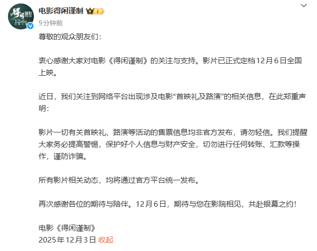 电影得闲谨制郑重声明得闲谨制首映礼及路演均将通过官方平台统一发布 电影得闲谨制郑重声明,得闲谨制首映礼及路演均将通过官方平台统一发布,一切通过官方平台统一发布,期待住和得闲谨制的影院的正式见面啦~