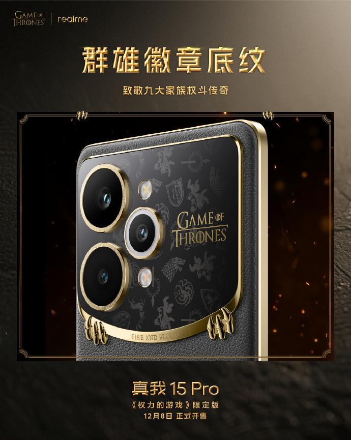 真我15Pro《权力的游戏》限定版外观设计公开了《权力的游戏》史诗金印、九大家族徽章暗纹Deco、镜头环铭刻史塔克家族与兰尼斯特家族经典台词、精密雕刻的龙爪与经典台词、坦格利安家族徽章、还有全球首创热感变色设计
