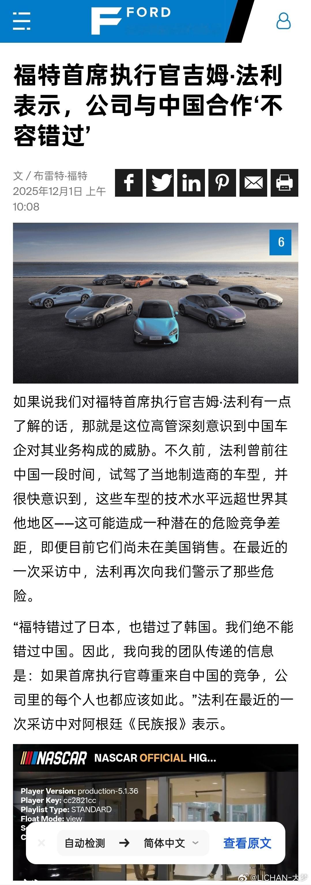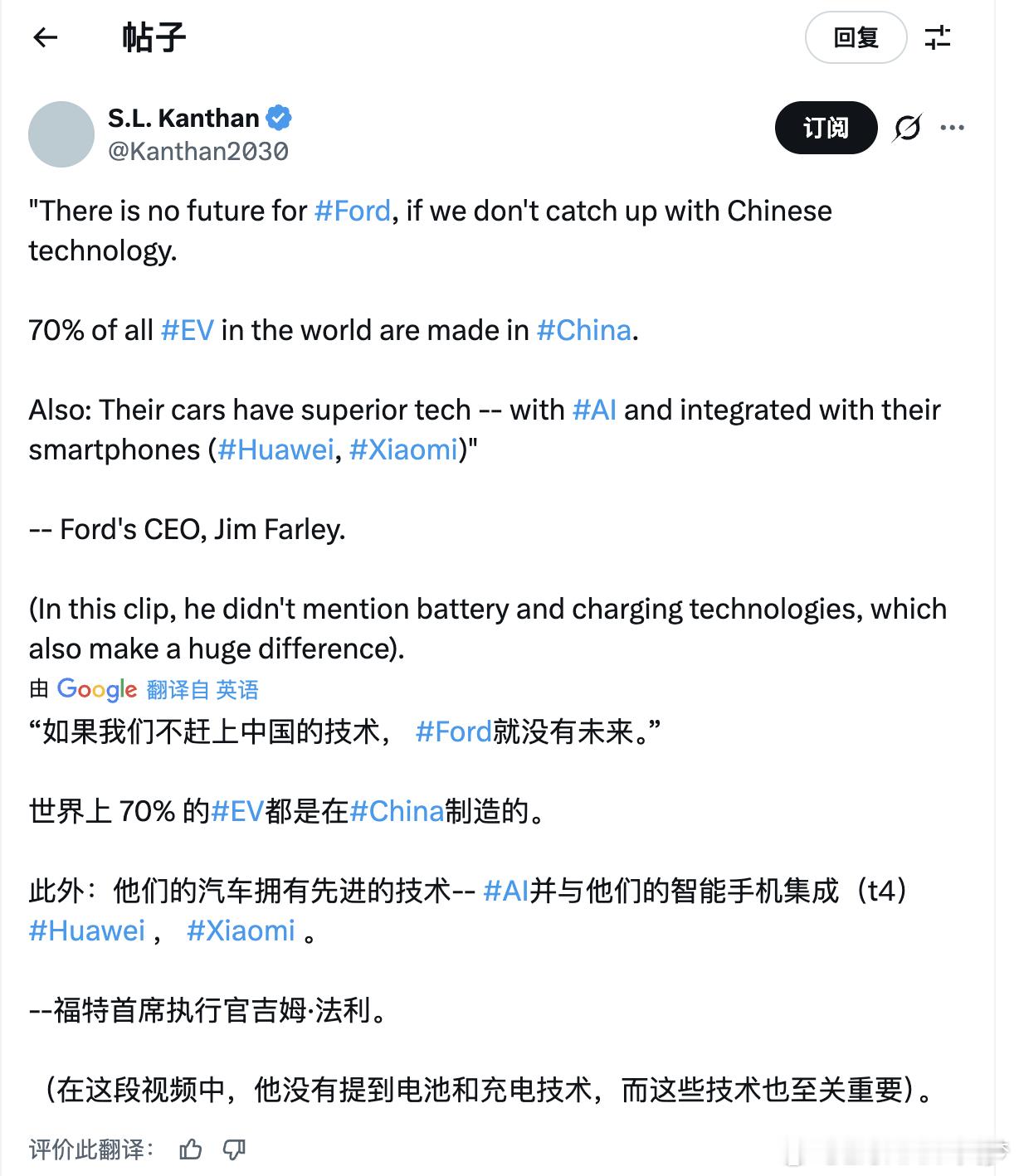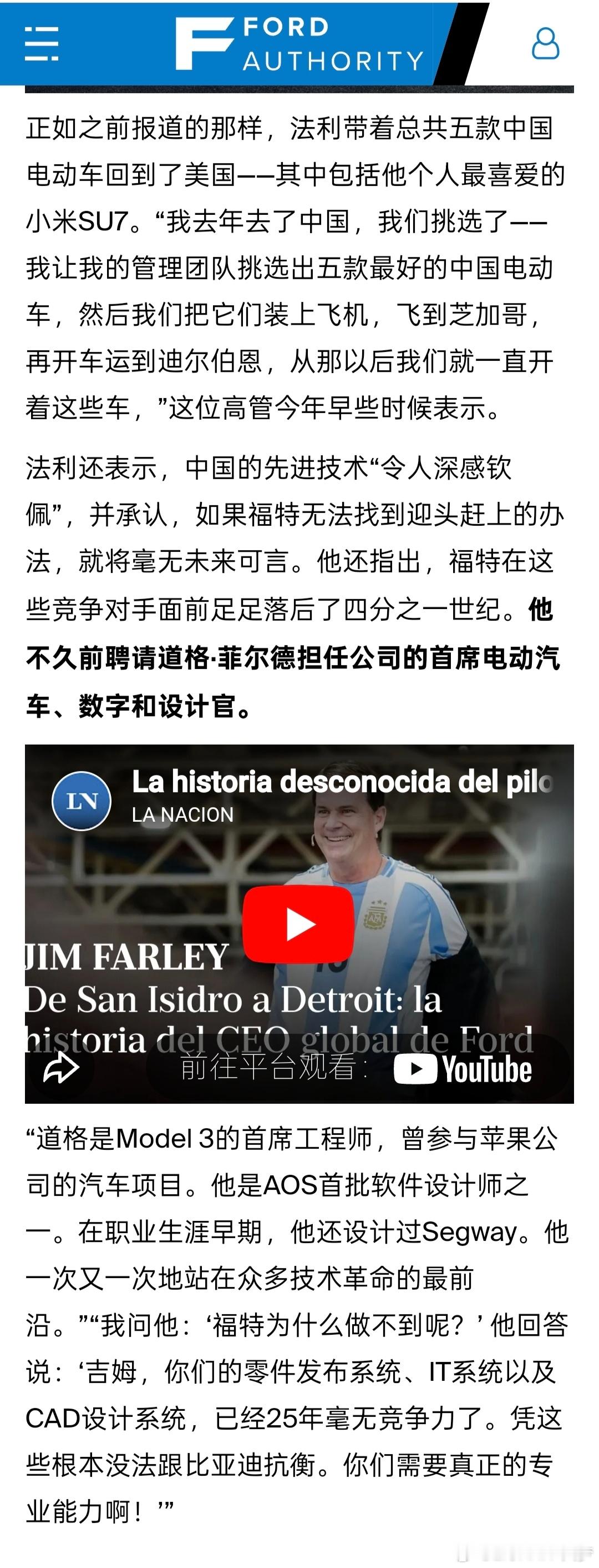 福特CEO还是挺实诚的,大大方方承认自己把小米SU7搞回来做了研究,而且不吝赞美之词,这点先好评一下。他还说了句大实话,福特在IT和设计系统上落后中国25年,更爱小米的跨界设计和生态系统体验,说小米打中了他们的软肋别的不说,就这企业家格局就得好评,有差距就客观承认然后迎头赶上,脚踏实地的一步步走,一步步优化产品,企业才能变好,市场也才会认可你这就是造车的正道,而不是利用神秘力量搅浑舆论,打掉对手也并不能让你变好,这是非常重要的意识问题,虽然某些人从来意识不到这一点于企业家来讲,能够接受别人的好,甚至夸赞你的对手就是格局的体验,而不是贬低、嘲笑别人的产品。