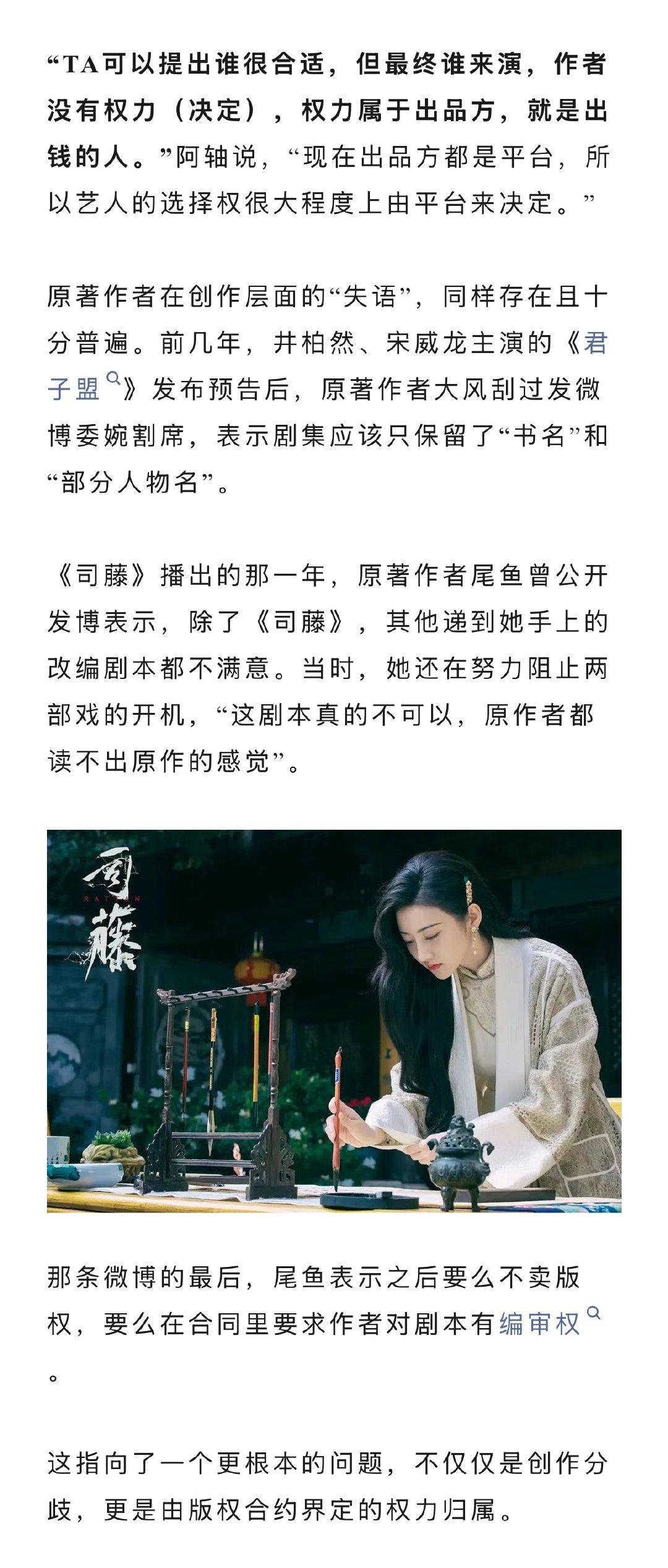 原著作者很少有权决定影视化选角 顾漫桐华是能挑演员的影视化作者 多数作者或许豆面零相似的处境——对选角与剧本缺乏话语权,只能在作品完成后选择支持、沉默甚至划清界限。在这个由平台和资方主导的改编体系中,原著作者到底应该如何自处?