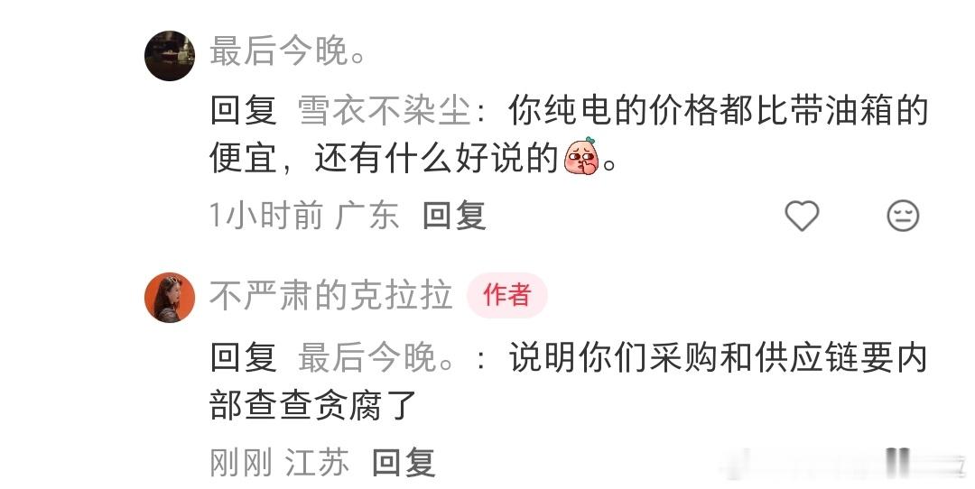 你纯电的价格都比带油箱便宜,说明什么?答:说明你们采购和供应链要查贪腐