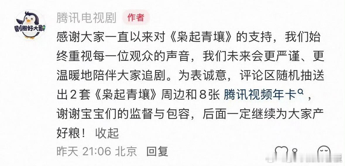 腾讯电视剧道歉腾讯电视剧官方账号因回怼粉丝“外行指导内行”“宝宝你是第一名”引发公众不满,现已道歉并表示会处理相关人员。粉丝提意见是关注,不是指责,官方带情绪怼粉纯属本末倒置。《枭起青壤》本就争议不断,官微还火上浇油,平台能不能管好运营?别让个别人的态度问题毁了剧集口碑!