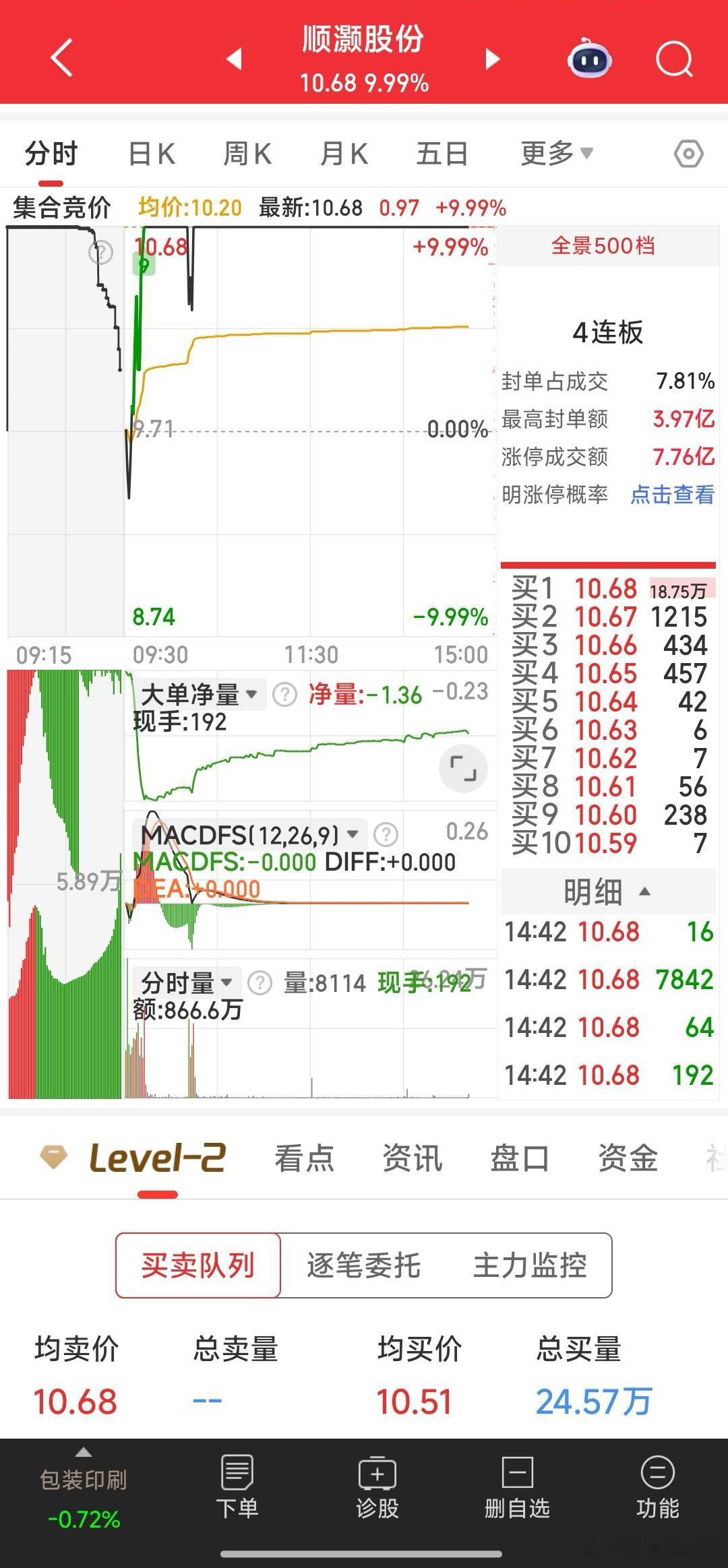 .【撤单喽】高乐股份,封量太大,成交太少,难上车,故撤单明天再看。