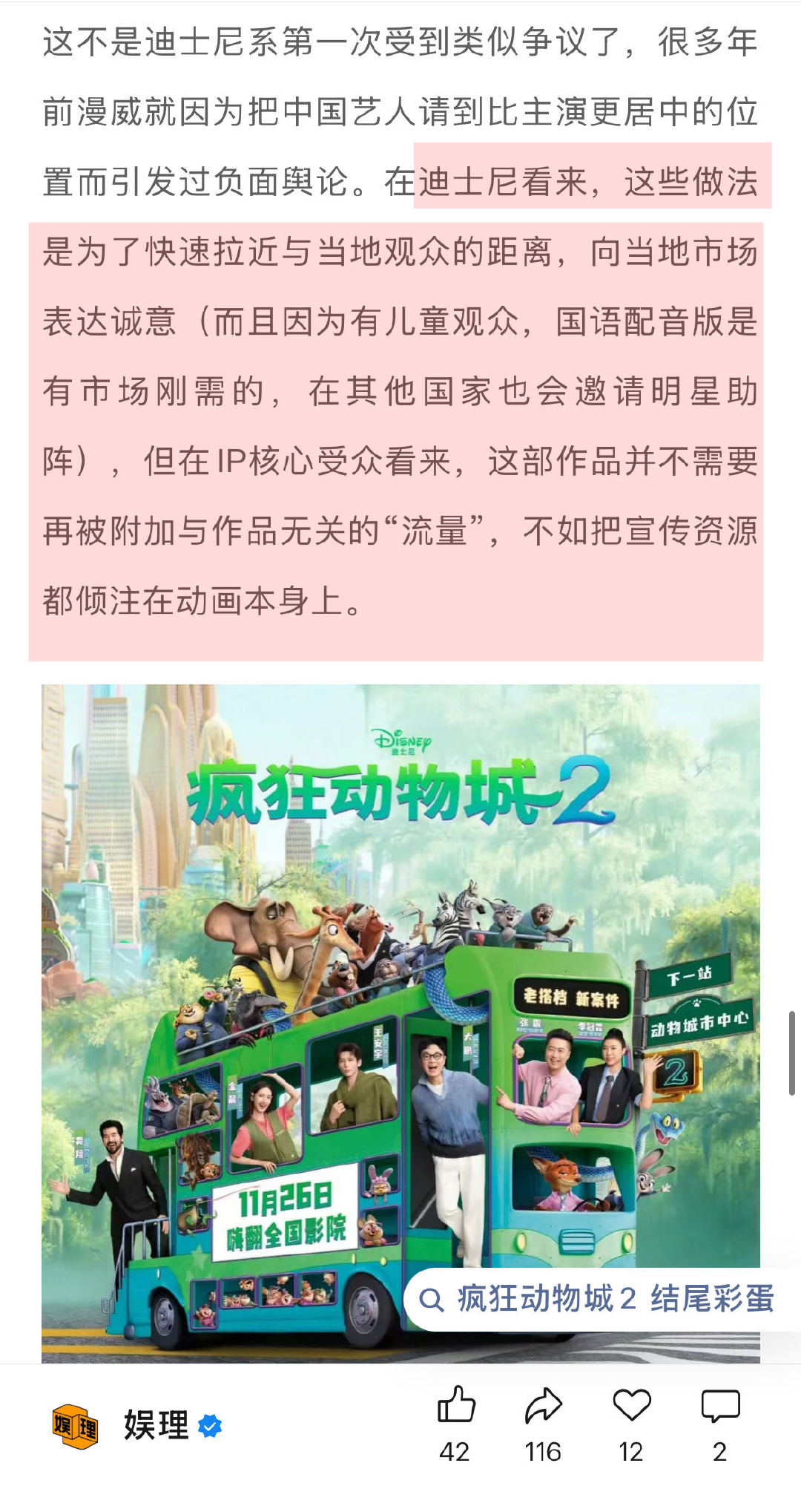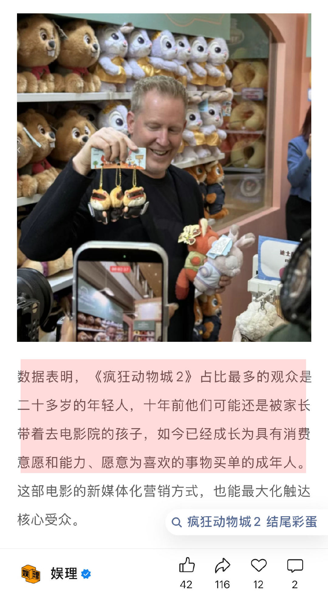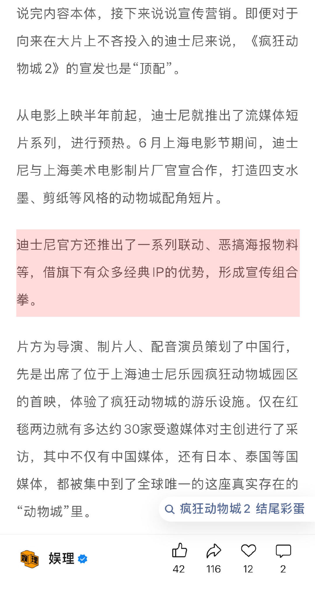 疯狂动物城2周边卖爆 为什么疯狂动物城2能救市 即便对于向来在大片上不吝投入的迪士尼来说,《疯狂动物城2》的宣发也是“顶配”。电影上映半年前就推出了流媒体短片系列。6月上海电影节期间,迪士尼与上美影厂官宣合作,打造四支水墨、剪纸等风格的动物城配角短片。官方还推出了一系列联动、恶搞海报物料等,借旗下有众多经典IP的优势,形成宣传组合拳…娱理独家↓