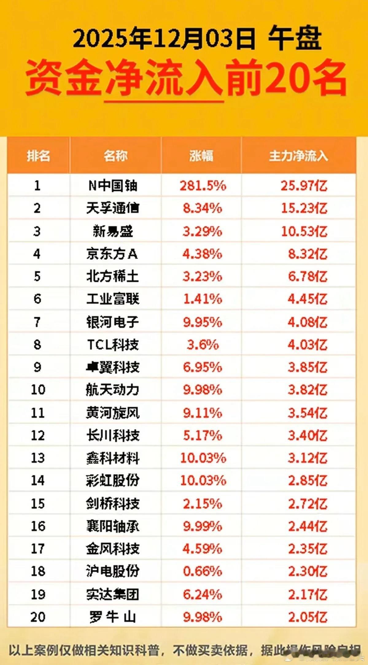 12.3午盘资金净流入top20梳理分析今日榜单呈现“新股领涨+赛道龙头+题材联动”的资金布局特征:新股N中国铀以281.5%涨幅、25.97亿主力流入居首,反映资金对新上市赛道标的的追捧;同时,资金既配置算力(天孚通信)、面板(京东方A)、稀土(北方稀土)等业绩预期明确的细分龙头,也炒作商业航天、地域等题材股((银河电子、罗牛山),整体兼顾“赛道价值”与“热点情绪”。个股梳理1. N中国铀新股上市首日涨281.5%,主力净流入25.97亿,是央企背景天然铀企业,受益全球能源结构调整的赛道预期。短期热度由新股流动性+赛道概念驱动,后续需观察行业政策及业务落地进度,波动风险较高。2. 天孚通信主力流入15.23亿,光模块细分龙头,产品适配算力基础设施升级需求。近期算力赛道持续升温,其高端光模块放量有望带动业绩改善,资金流入体现对赛道龙头的布局偏好。3. 新易盛主力流入10.53亿,聚焦1.6T光模块+CPO技术,契合算力赛道技术趋势。当前高端光模块进展顺利,资金布局既追短期赛道热度,也关注其业绩兑现潜力,属于赛道成长型标的。4. 京东方A主力流入8.32亿,全球面板龙头,受益面板行业价格企稳回升的周期回暖预期。业绩与面板价格高度关联,短期随行业景气度上行,是周期赛道的核心配置标的之一。5. 北方稀土主力流入6.78亿,稀土行业龙头,掌控核心资源,受益稀土价格企稳及下游新能源需求支撑。资金流入体现对资源类赛道的配置需求,后续需关注稀土价格波动对业绩的影响。6. 工业富联主力流入4.45亿,算力硬件核心供应商,覆盖服务器等算力基础设施。巨头级布局带来稳定订单预期,资金布局偏长期配置逻辑,随算力赛道热度延续逐步兑现价值。7. 银河电子主力流入4.08亿,沾商业航天+智能终端概念,近期板块升温带动情绪炒作。但相关业务占比有限,短期涨幅以题材驱动为主,需警惕板块退潮后的波动风险。8. TCL科技主力流入4.03亿,面板行业龙头之一,受益面板周期回暖的板块联动效应。近期面板价格企稳提升行业景气度,资金布局随板块热度上行,业绩端有望逐步修复。9. 卓翼科技主力流入3.85亿,聚焦消费电子+AI硬件供应链,近期AI终端热度带动关注度。但相关产品订单占比仍低,短期涨幅以题材炒作为主,缺乏业绩强支撑。10. 航天动力主力流入3.82亿,属航天军工领域,受行业动态催化板块热度升温。资金借情绪炒作其题材关联,业务涉航天动力系统,短期随板块热度波动。11. 黄河旋风主力流入3.54亿,培育钻石+超硬材料龙头,近期培育钻石需求复苏预期升温。超硬材料适配高端制造场景,资金布局既看赛道复苏,也关注产品放量的业绩潜力。12. 长川科技主力流入3.40亿,聚焦半导体检测设备,受益行业设备需求回暖。检测设备适配芯片制造环节,资金布局看重半导体设备赛道长期成长逻辑,短期随行业景气度上行。13. 鑫科材料主力流入3.12亿,涉新材料+金属加工业务,借板块热度炒作概念。但相关业务规模较小,短期涨幅以情绪驱动为主,业绩支撑较弱。14. 彩虹股份主力流入2.85亿,面板企业,受益行业周期回暖的板块联动。近期面板价格企稳带动热度,资金借情绪炒作,业绩与行业景气度高度相关。15. 剑桥科技主力流入2.72亿,光模块细分标的,产品适配算力基础设施需求。随算力赛道热度延续,资金关注其细分布局,短期随赛道波动,长期看产品放量节奏。16. 襄阳轴承主力流入2.44亿,属汽车零部件领域,借汽车产业链题材热度炒作。当前业务增长平稳,短期涨幅以题材驱动为主,缺乏持续成长逻辑。17. 金风科技主力流入2.35亿,风电设备龙头,受益行业政策支持及装机需求回升。风电整机订单充足,资金布局看重赛道长期成长,短期随政策催化上行。18. 沪电股份主力流入2.30亿,聚焦PCB业务,适配算力服务器硬件需求。近期算力升级带动PCB需求,资金布局看重其供应链地位,短期随赛道热度兑现业绩。19. 实达集团主力流入2.17亿,沾智算中心+福建国资概念,借算力、国资题材炒作。但智算业务落地进度不明确,短期涨幅以情绪驱动为主,风险较高。20. 罗牛山主力流入2.05亿,涉海南自贸港+农业概念,借地域题材热度炒作。农业主业增长平稳,短期涨幅以题材驱动为主,缺乏业绩弹性。总结本次资金布局呈现“分化特征”:一类是算力、面板、稀土等赛道龙头,具备业绩或行业景气度支撑;另一类是商业航天、地域等题材股,短期情绪驱动特征明显。后续需区分标的类型,赛道龙头关注行业景气度持续度,题材股需警惕退潮风险。本文涉及资讯、数据等内容来自网络公共信息,仅供参考,不构成投资建议!