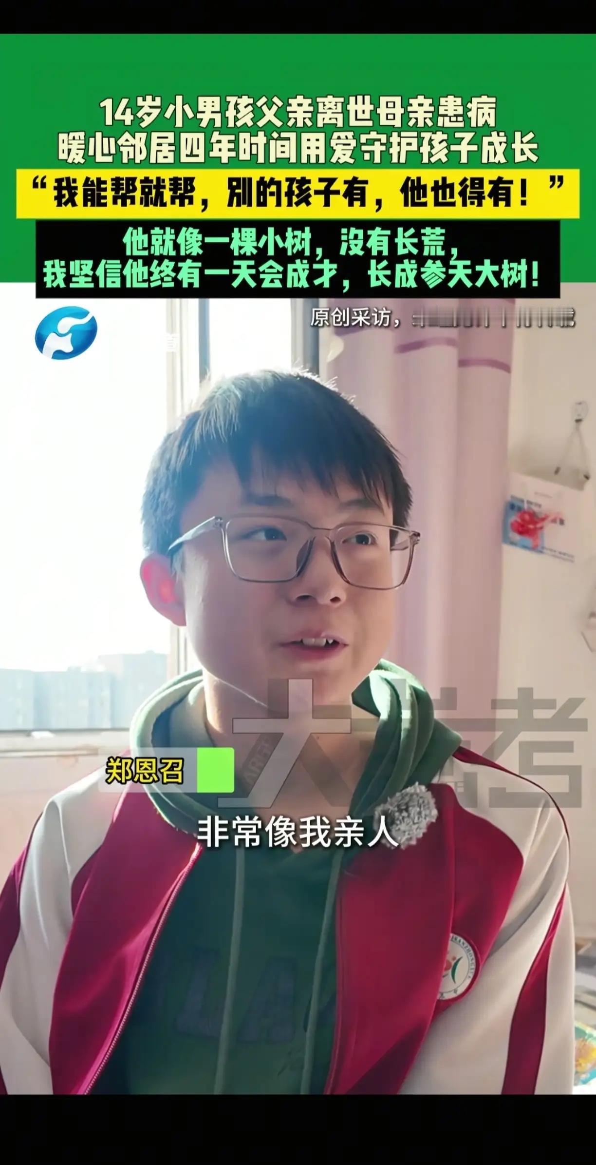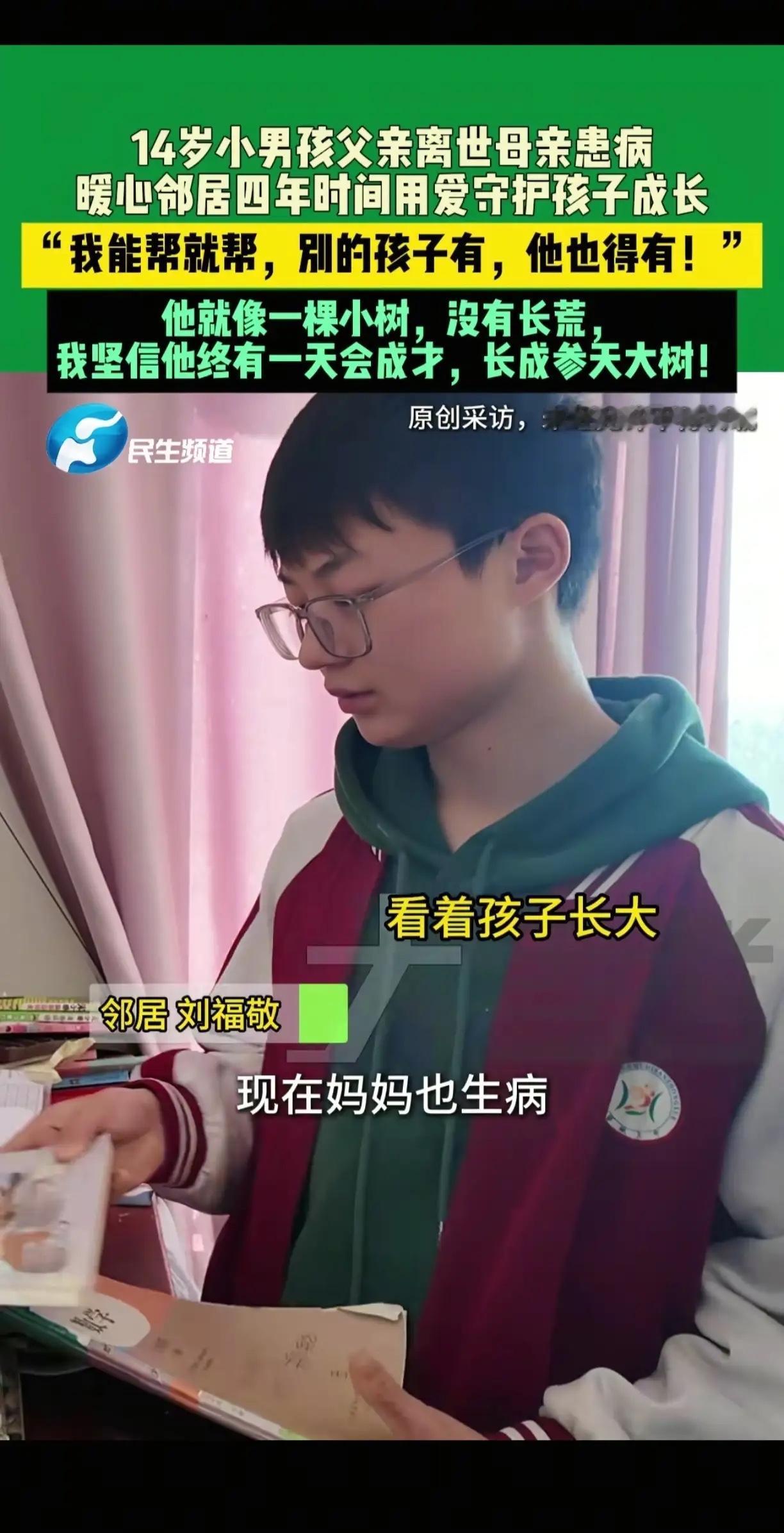中国好邻居!河南郑州一名女子的邻居,父亲因脑梗去世,母亲又患病在身,留下一个14岁的男孩,经常没人照顾,于是女子主动帮忙照顾,无论家里做了什么好吃的,都会多做一些送给男孩。 刘福敬老远看见男孩蹲在楼道里啃凉馒头,手里攥着皱巴巴的作业纸。她转身回屋端了碗刚熬的粥,递过去时,男孩的指尖冻得发红,接碗的手都在抖。 “以后来我家吃。”她摸了摸男孩的头,他闷声“嗯”了句,粥喝得急,嘴角沾了米粒也没顾上擦。这一照顾,就是四年,男孩的校服从宽松变合身,个子也蹿到了她肩膀。 晚上她炖了排骨,盛了满满一盘送过去。推开门看见男孩在给母亲擦脸,动作轻得像怕碰碎什么。他看见她,眼睛亮了亮:“刘姨,我这次数学考了90分。” 采访时男孩戴着眼镜,说“刘姨像亲人”。她坐在厨房擦盘子,听见这话红了眼:“别的孩子有的,他也得有。”窗外的阳光落在案板上,盘里的菜香裹着暖,像把日子焐得软和了。 现在男孩放学就往她家跑,放下书包就择菜。她炒着菜回头,看见他把青菜码得齐整,突然觉得这孩子像棵小树,没长荒,还透着往上冒的劲儿。 好邻居好一辈子