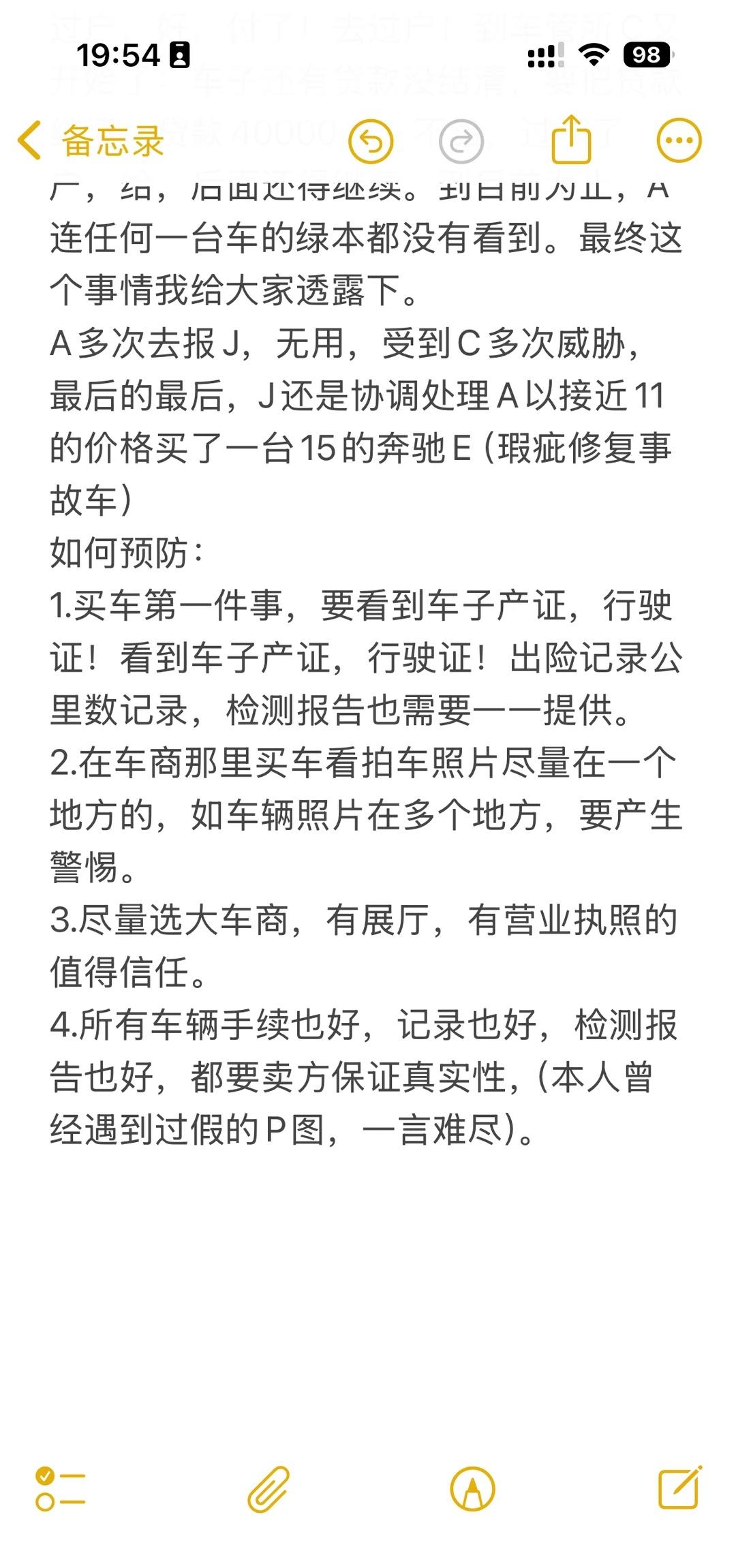 反诈贴:买卖二手车谨防被骗~ 作为从业十几年的二手车车贩子,我感觉自己有义务发一些自己的个人经验,仅供参考。举例都是身边真人真事。 一、卖车套路 最近挺多人卖车遇到的套路。 举例:A卖车135000元的满意价格给B某不知名车商还是中介,先付一半多70000,尾款65000过完户给,理由是怕卖方不配合过户,车子提走后,很长时间不过户,A催着B过户,B以各种理由不给尾款,也不过户,后面竟然拉黑A,A报J没用经济纠纷(合同套路)到现在A也没办法,事情也得不到处理。 如何预防: 1.无论卖车给谁,全款不付清,不可以把车开走。 2.尽量卖给值得信任的人。 3.合同约定过户时间(实际操作也不容易) 二、买车套路 骗订金的就不说了,不要随便付订金,随时有可能把你拉黑,订金定金都一样。 1.底价套路 举例A在网上看到一台奔驰很便宜,和卖车销售美女B聊的非常开心,再三确认全款价格56800,开心的付了定金,千里迢迢飞到现场一个大场地,注意!接待的人开始变成了抠脚大汉C,美女没了,车非常多,奔驰已售了,现场选一台,不选不退定金,报J没用,经济纠纷,选了一台其他车,开始第二个套路。 2.合同套路 A无奈以82800买了一台15年奔驰E260L,抠脚大汉C这边必须付全款才给过户,好,付了!去过户!到车管所C又开始了:车子还有贷款没结清,要把贷款结清,贷款40000多,不给,过不了户,给,后面还得继续。到目前为止,A连任何一台车的绿本都没有看到。最终这个事情我给大家透露下。 A多次去报J,无用,受到C多次威胁,最后的最后,J还是协调处理A以接近11的价格买了一台15的奔驰E(瑕疵修复事故车) 如何预防: 1.买车第一件事,要看到车子产证,行驶证!看到车子产证,行驶证!出险记录公里数记录,检测报告也需要一一提供。 2.在车商那里买车看拍车照片尽量在一个地方的,如车辆照片在多个地方,要产生警惕。 3.尽量选大车商,有展厅,有营业执照的值得信任。 4.所有车辆手续也好,记录也好,检测报告也好,都要卖方保证真实性,(本人曾经遇到过假的P图,一言难尽)。