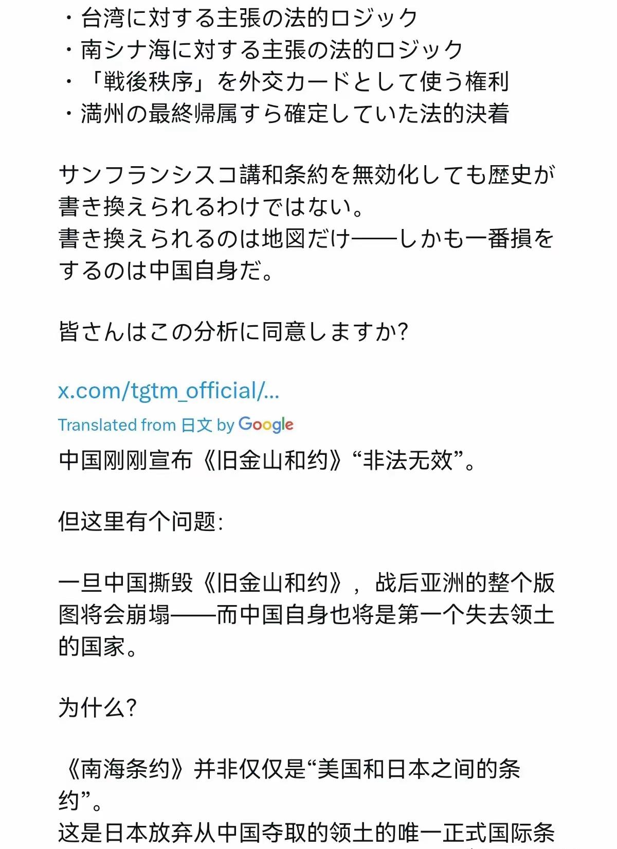 日本学者声称,中国自己掉入到了“陷阱”之中!12月3日,一名日本学者声称,中国刚宣布《旧金山和约》“违法且无效”,但这里存在一个陷阱,中国否定《旧金山和约》的瞬间,整个战后亚洲的版图将“彻底崩塌”——而最先失去领土的,恰恰是中国自身。 这种论调听起来挺唬人,实际上却是在偷换概念。咱们得先搞清楚,《旧金山和约》本身就是冷战时期的特殊产物。1951年签这份条约时,新中国明明已经成立两年,却被故意排除在外,台湾的蒋介石集团也没被邀请。一个涉及战后东亚格局的决定性文件,居然把最重要的当事国晾在一边,这种“一言堂”式的安排,从一开始就埋下了祸根。 这位日本学者所谓的“陷阱论”,其实是把水搅浑。他暗示中国否定《旧金山和约》就会动摇自身领土主张,这完全站不住脚。国际法领域的朋友打了个比方:就像有人擅自把你家的房产拿到市场上拍卖,难道你还得承认这份买卖合同有效?中国对台湾、钓鱼岛的主权主张,根植于《开罗宣言》《波茨坦公告》等二战后期确立的法律文件,这些才是构建战后秩序的基石。《旧金山和约》充其量只是美国为打造亚太同盟体系搞出的“补丁程序”,现在有人想把这个“补丁”说成是“操作系统”本身,未免太抬举它了。 特别值得玩味的是日本学者的焦虑感。他们担心中国否定《旧金山和约》会冲击战后体系,其实恰恰暴露了日本某些势力对现行秩序的心虚。要知道,正是这部条约故意模糊了台湾归属问题,为后来的争端埋下伏笔。如今中国重申历史真相,相当于把歪曲的坐标系摆正,某些人自然要跳脚。但从国际法实践看,埃及1951年就宣布不承认《旧金山和约》关于日本战败处理的条款,也没见战后体系就此崩溃。 说到领土问题,倒是日本自己该好好翻翻历史账。《旧金山和约》规定日本放弃对台湾、澎湖的权利,但故意不写明归还对象。这种政治操弄现在反而成了包袱——按照日本政府的逻辑,他们至今连台湾究竟该归谁都没法自圆其说。中国现在把这个问题挑明,等于将了某些人一军。毕竟在1972年《中日联合声明》里,日本明确承诺遵守《波茨坦公告》第八条,而公告白纸黑字写着日本主权限于本州、北海道、九州、四国及盟国确定的附属岛屿。 咱们普通网友可能更关心这事对现实的影响。最近日本在西南诸岛加强军事部署,菲律宾也在南海频繁动作,这些背后都有美国的影子。中国此时重提《旧金山和约》的非法性,其实是在拨乱反正——既然有人想靠冷战遗产来制造矛盾,那我们就有必要正本清源。毕竟台湾问题涉及中国核心利益,在这个问题上不存在任何模糊空间。 从战略层面看,这种学术争论反映的是更深层的秩序博弈。美国主导的旧金山体系正在松动,中国倡导的人类命运共同体理念获得越来越多响应。日本某些人死抱着七十年前的条约当“护身符”,反而说明他们对未来缺乏自信。事实上,东盟国家多数没有参与旧金山和约,缅甸、印度甚至拒绝签字,这本就不是亚洲国家的共同选择。 与其纠结过时的条约,不如看看现实发展。RCEP区域贸易协定正在重塑亚洲经济版图,“一带一路”倡议带来实实在在的互联互通。这些活生生的合作,比冷战时期的纸面文件更有生命力。中国否定的是非法条约,坚持的却是真正的多边主义。 各位读者你们怎么看?欢迎在评论区讨论。