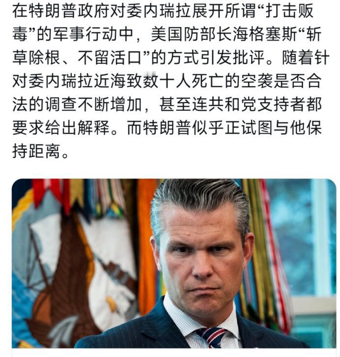 12月2日,特朗普政府对委内瑞拉开展“打击贩毒”的军事行动,美国国防部部长海格赛斯“斩草除根、不留活口”的方式,引发批评,随着调查,连共和党支持者都要求给出解释,特朗普选择和他保持距离。 说实话,美国这种做法确实有些残暴,很有可能是在隐藏事情的真相,毕竟在电视剧里,最常看到的台词就是“只有死人,才没有秘密”,跟这次的行为很像。 而且一个小小的国防部部长,哪里来的胆量敢说出那么硬气的话,很有可能是受到了特朗普的指示,就像那一句“老莫,我想吃鱼了”一样有含金量。 而这次事件也告诉了我们一个真相,弱国无外交,落后就挨打,只有自己的国家足够强大了,别人在动手前才会考量一下,对方是否会有追责的可能。 而特朗普选择疏远国防部部长的时候,很有可能是想让他当“背锅侠”了。 说到底,这很有可能是美国打着“打击毒贩”的旗号,实施恐怖袭击的行为,是美国霸权主义的又一次赤裸暴露,用残暴的手段掩盖不可告人的秘密,甚至还把“嫁祸背锅”玩的明明白白。