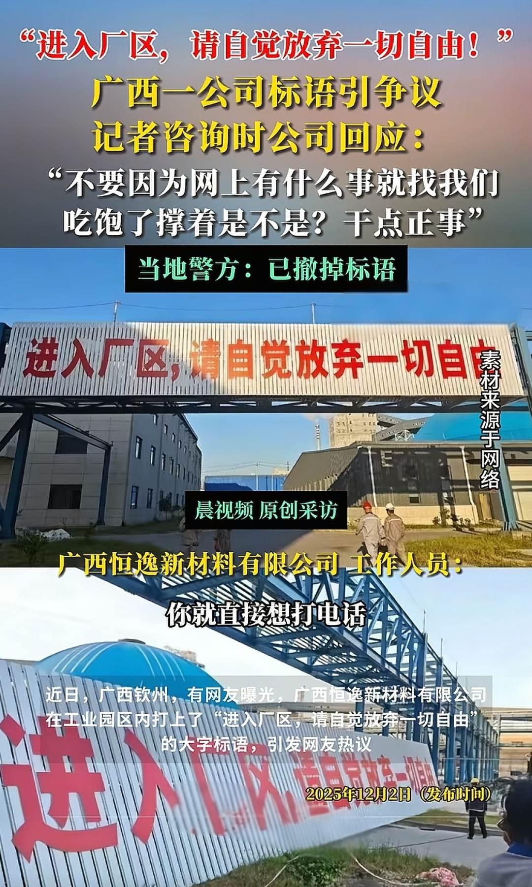 "进入厂区,请自觉放弃一切自由!"广西一公司挂出标语引争议,当地公安:公司已撤掉标语#媒体精选计划 #广西 #厂区 #自由 #争议