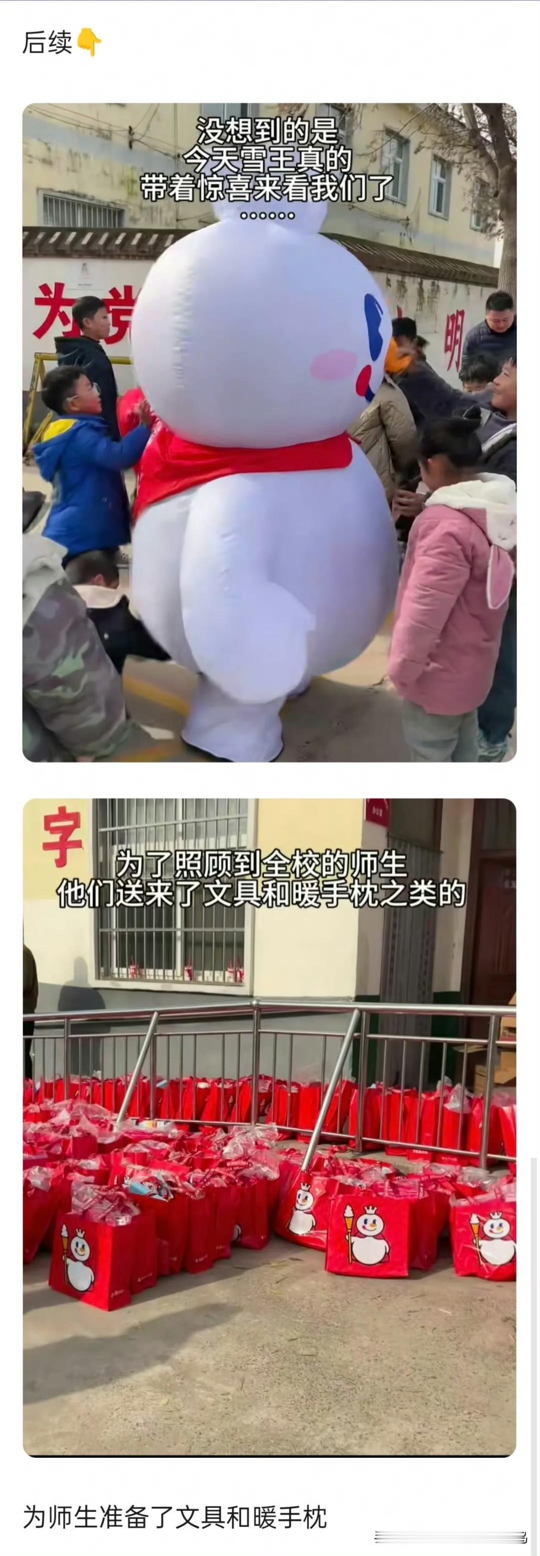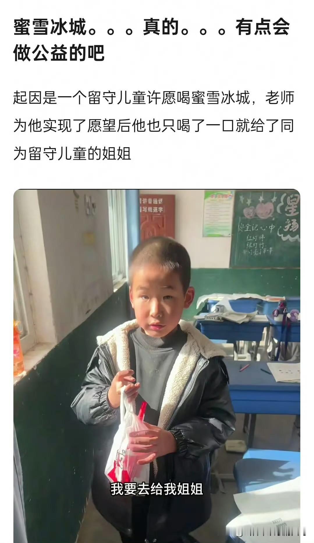 香港火灾惨重, 谁能想到,靠3元柠檬水攒利润的蜜雪冰城,二话不说捐出2000万港元,这可不是公关秀,是从千万杯茶饮里省出来的真心。 不仅如此,蜜雪冰城的社会责任感非常重,有个留守儿童许愿要喝蜜雪冰城,老师知道后给他买了一杯,这个孩子就喝了一口就说要带回去给自己的姐姐。 这件事被这个老师发到网上后,蜜雪冰城直接就去了当地,不仅让孩子们都喝上了奶茶,还带了文具和暖手枕这些礼物。 其实企业的担当从不在规模大小,而在危难时愿不愿伸手,蜜雪冰城一直在证明,靠谱的品牌从来都揣着滚烫的良心。