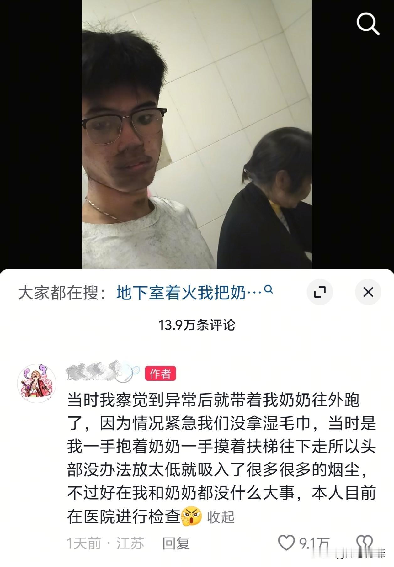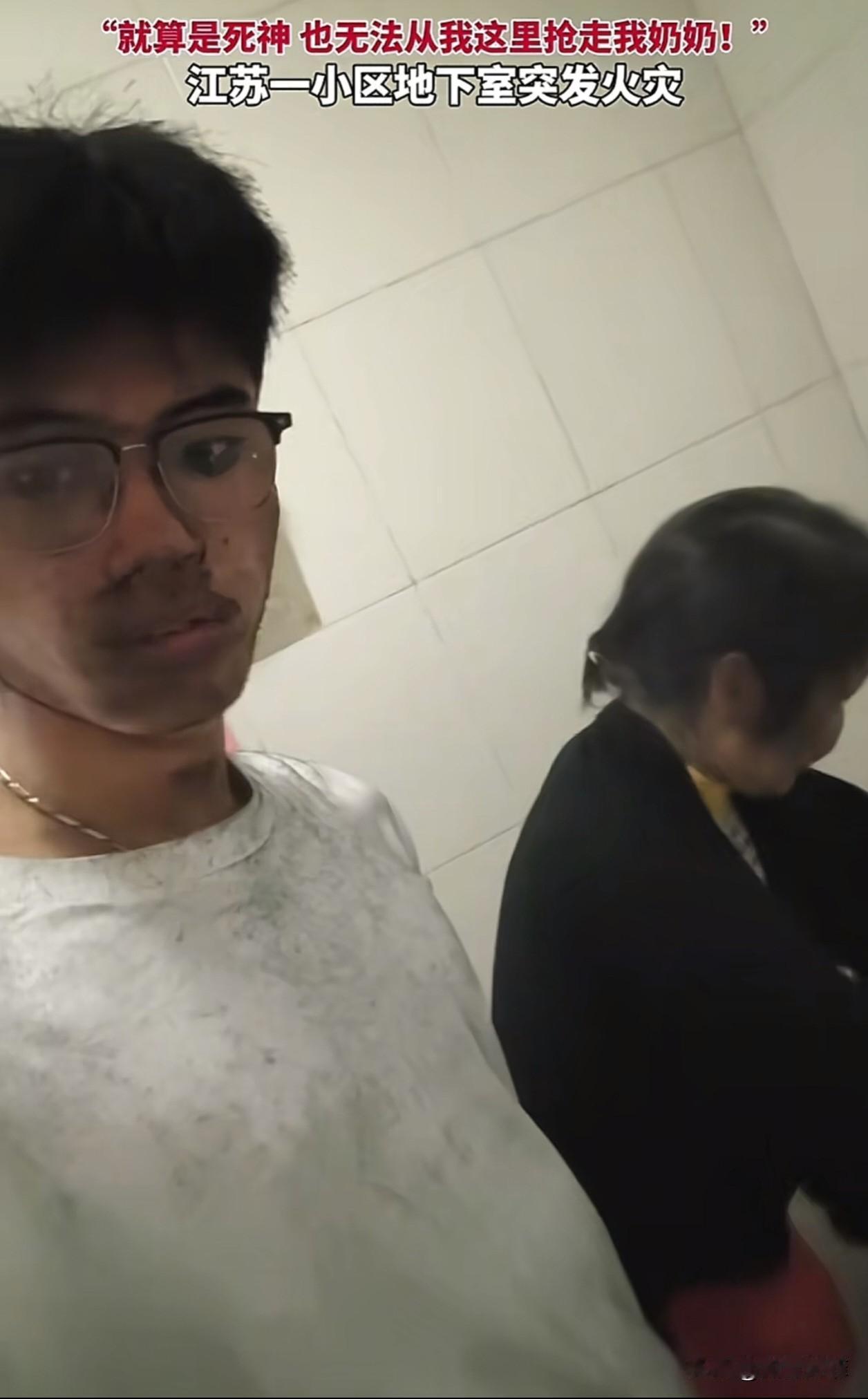 江苏,一小区地下车库突然起火,浓烟弥漫楼道,危急时刻,一17岁小伙单手抱起腿脚不便的奶奶,从四楼逃生,小伙自己满脸黑灰,奶奶被他完好护在怀中,两人都无大碍。 当晚小区地下室的电瓶车起火,很快产生了大量有毒的浓烟,顺着楼道往上涌,一下子就把楼道遮得看不清路。 睡梦中的小伙被刺鼻的烟味和异响惊醒,他第一时间冲到奶奶房间,想着必须把奶奶安全带出去。 当时情况特别紧急,小伙来不及找湿毛巾捂住口鼻,就直接单手抱起奶奶,另一只手抓着楼梯扶手,在浓烟里慢慢往下挪。 为了抱稳奶奶,他没办法低头躲烟,只能扛着烟尘往前走,他脑子里就一个念头:不能让奶奶出事。 最后两人成功脱险,小伙满脸黑灰,奶奶因为被紧紧护在怀里,身上干干净净。 之后两人去了医院检查,奶奶没什么事,小伙吸入太多浓烟确诊了吸入性肺炎。现在小伙的身体也恢复的差不多了,已经正常上学了。 小伙是真男人,也是奶奶的超级英雄,17岁的年纪本该是被照顾的时候,他却能用单薄的臂膀抱起奶奶闯过浓烟,这份勇敢和担当特别难得,让人佩服。 小伙的孝心值得点赞,他对奶奶的爱和关心刻在骨子里,这种危难中对亲情本能的守护,很实在,也让人感动。