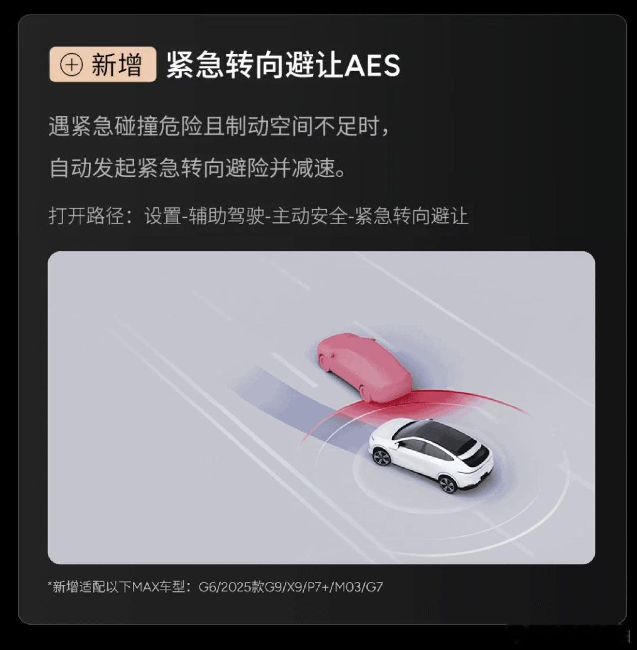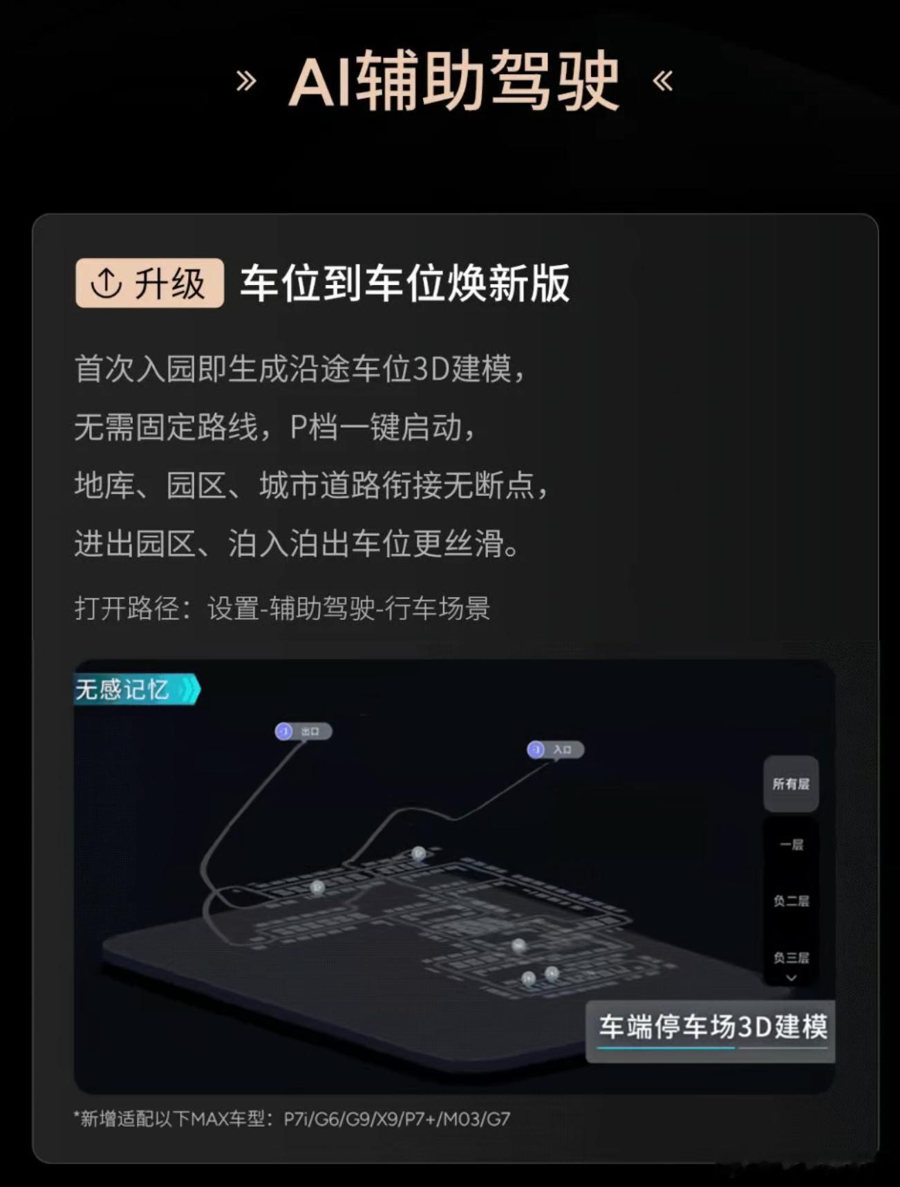 小鹏 XOS 5.8.5 开启推送新增车位到车位焕新版,首次入园就可以生成沿途车位 3D 模型。小鹏的「车位到车位」现在是无感激活/使用的,进入到固定园区之后不需要手动点击开启以及记忆这些按钮,系统会自动记录,等你下次再来的时候就能直接用了。我上次用了下,发现它还能主动抄近道,不会死板地走我绕老绕去的路,好评。还有一个比较重磅的功能是 AES 上了,这个之前实测过,能够对机动车、锥桶等目标进行 AES 避让,夜间也照样可以 130 km/h 避让,而且这一下就把 AES 的功能卷到 13 万级。智能驾驶大v聊车