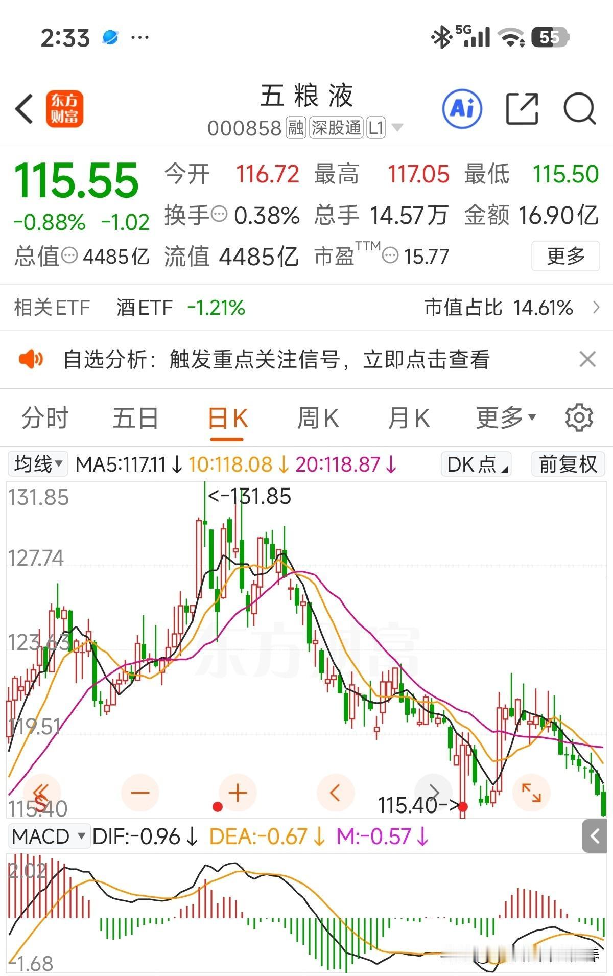 日线十连阴了,有人私信问我这货还在不在[捂脸],第一、个人布局中长线肯定还在,第二、最近一笔交易是在130元腾出了部分仓位到格力电器!仓位不重! 至于对五粮液的看法不变,目前这位置有投资价值,对于五粮液来说,股价弱不单是行业问题,管理层市值管理无能,大把账面现金,研究注销回购几年不动!大股东格局浅,明明可以通过提高分红拿到大量现金却通过所谓财务公司占用! 调整力度狠一点不是坏事,只有调整狠了,调整痛了,痛则思变!