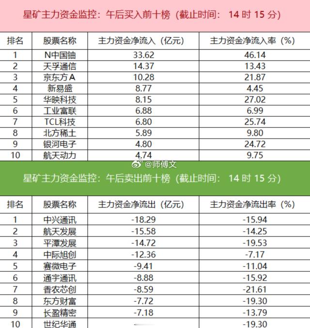 【主力资金监控:中兴通讯净卖出超18亿】星矿数据显示,今日主力资金净流入光学光电子、有色金属、工业金属等板块,净流出计算机、电子、电新行业等板块,其中计算机板块净流出超99亿元。个股方面,N中国铀主力资金净买入33.62亿元位居首位,天孚通信、京东方A、新易盛主力资金净流入居前;中兴通讯遭净卖出超18亿元位居首位,航天发展、平潭发展、中际旭创主力资金净流出额居前。财经理财 今日看盘