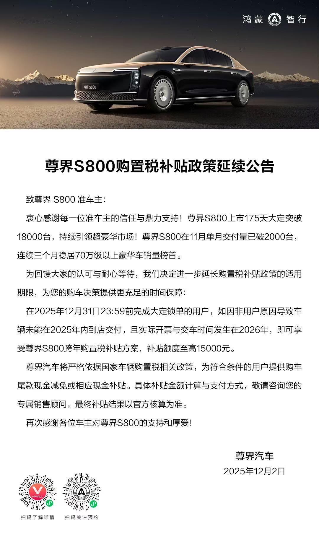 尊界 S800购置税补贴延续,立省15000。相当于送了一台 Mate X7