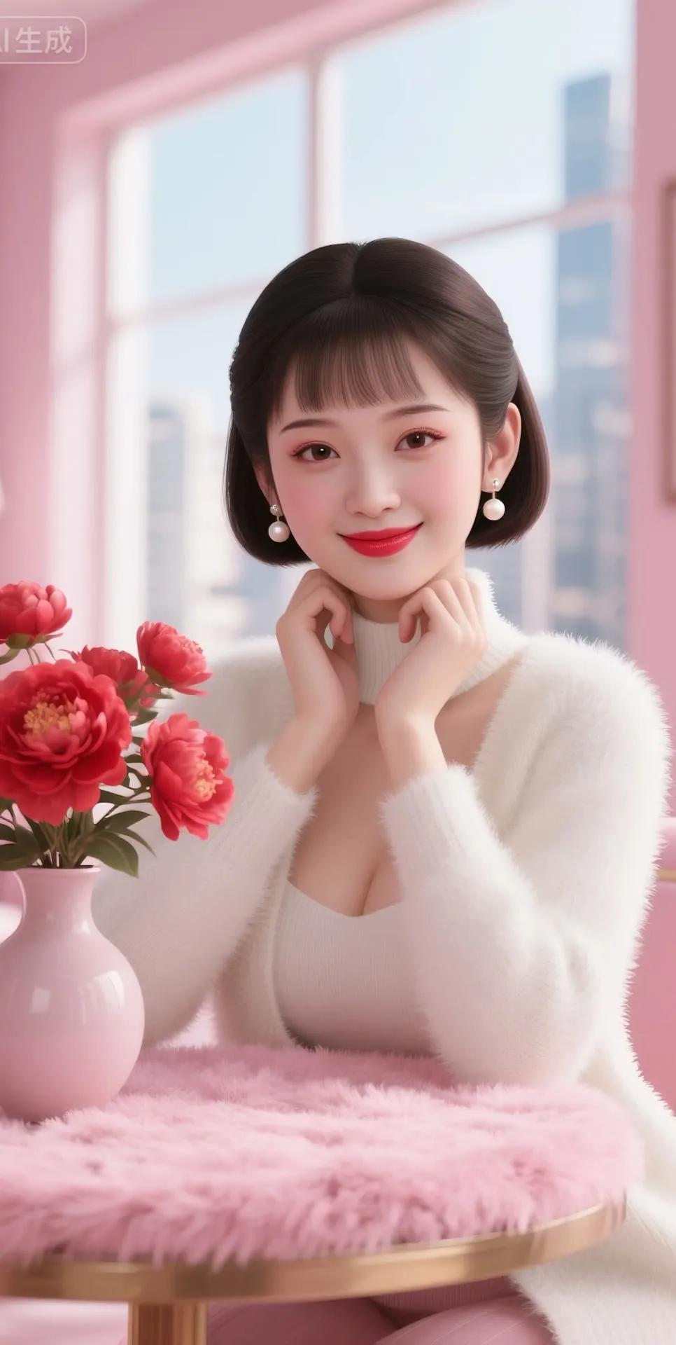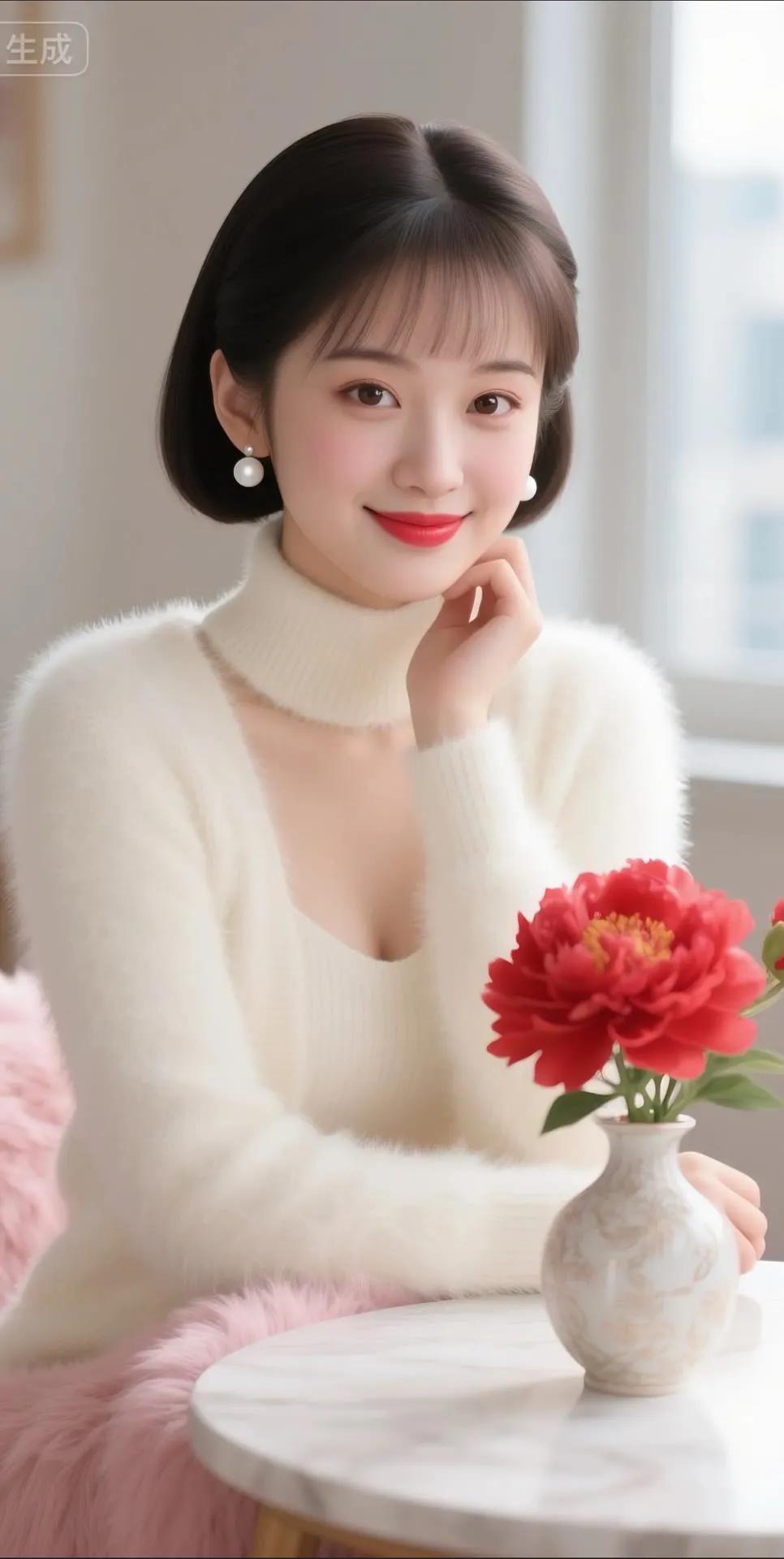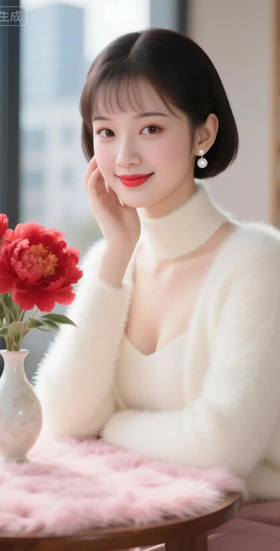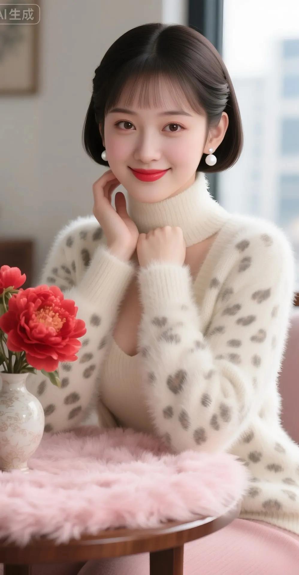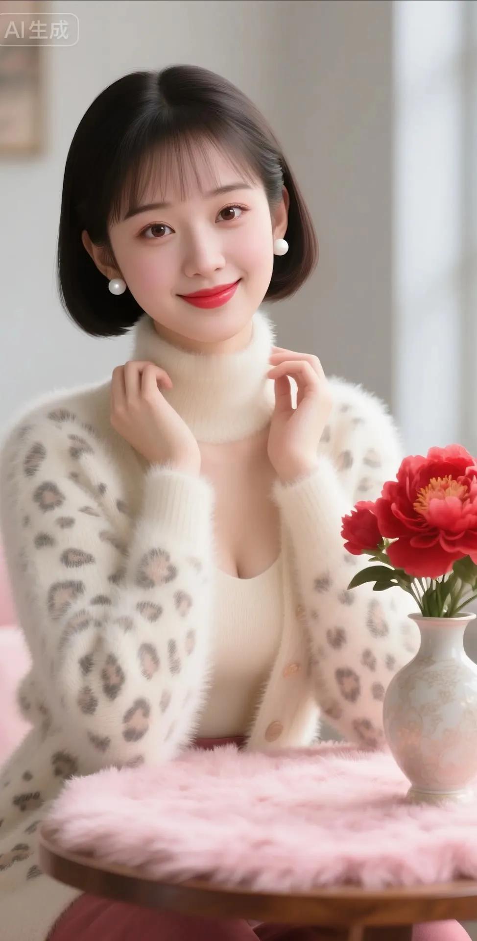 温柔冬日穿搭,暖心微笑,红艳花朵相伴,温暖如春