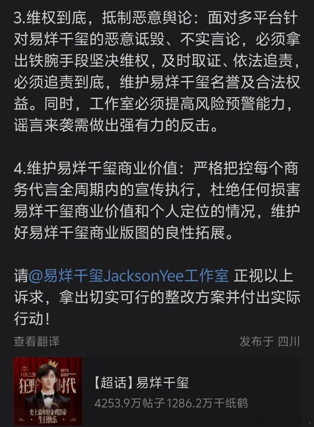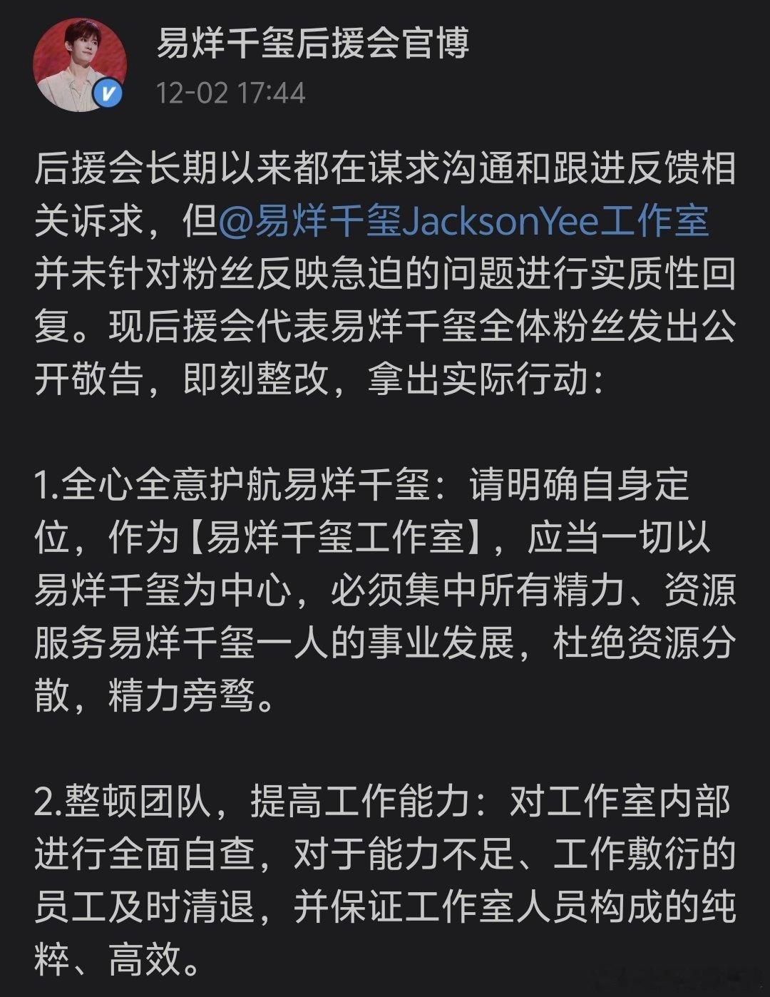 易烊千玺文淇 经纪人易烊千玺后援会要求易烊千玺工作室即刻整改,拿出实际行动!而易烊千玺和文淇是同一经纪人刘一萌,粉丝更提出不少意见,希望保证工作室人员的纯粹和高效。