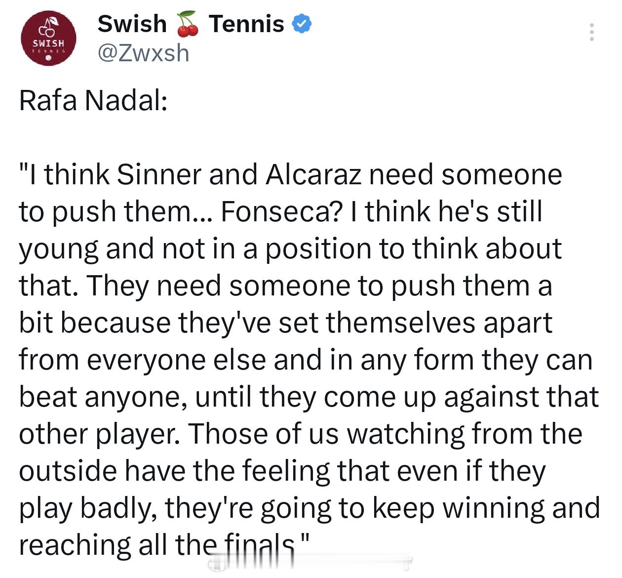 纳达尔:“我觉得辛纳和阿尔卡拉斯需要有人来激励他们......丰塞卡?我觉得他还年轻,还没到考虑这些的地步。他们需要有人来挑战他们,因为他们已经和其他所有人拉开了差距,无论状态如何,他们都能击败任何人,直到遇到那个强劲的对手。我们这些旁观者感觉,即使他们发挥失常,他们也会继续赢球,一路杀进决赛。”网球talking大会网球ATP